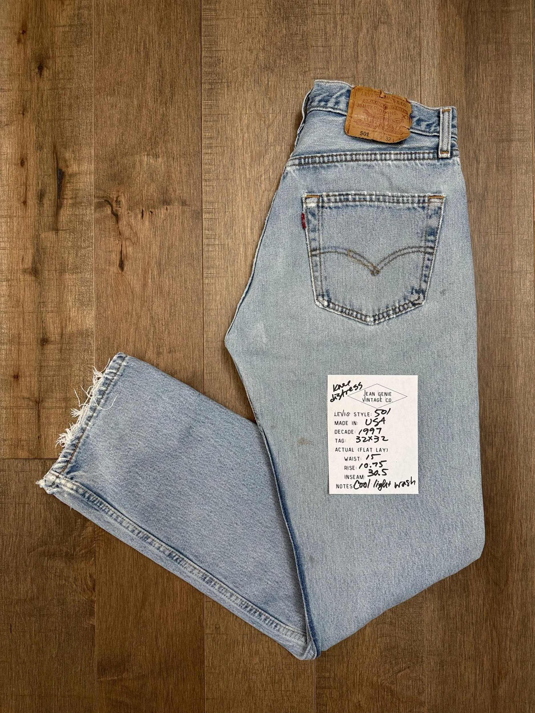 WASH: beautiful lighter blue wash with awesome organic sun fades, knee distress and small faint discoloration and small thin spots as shown in photos