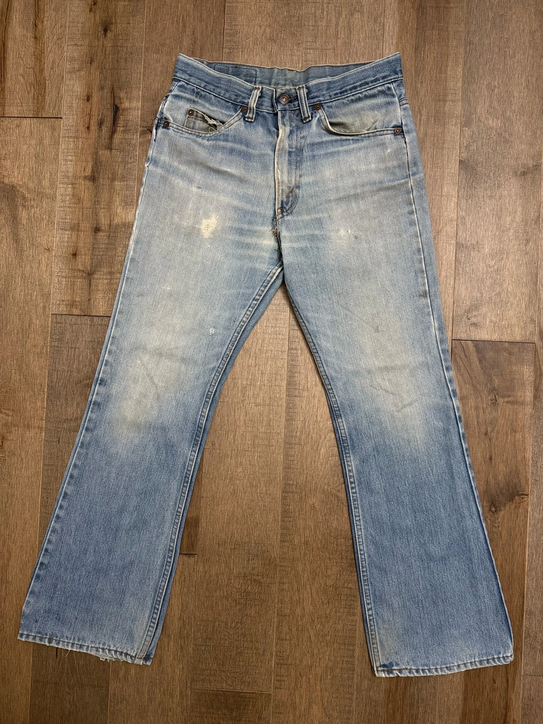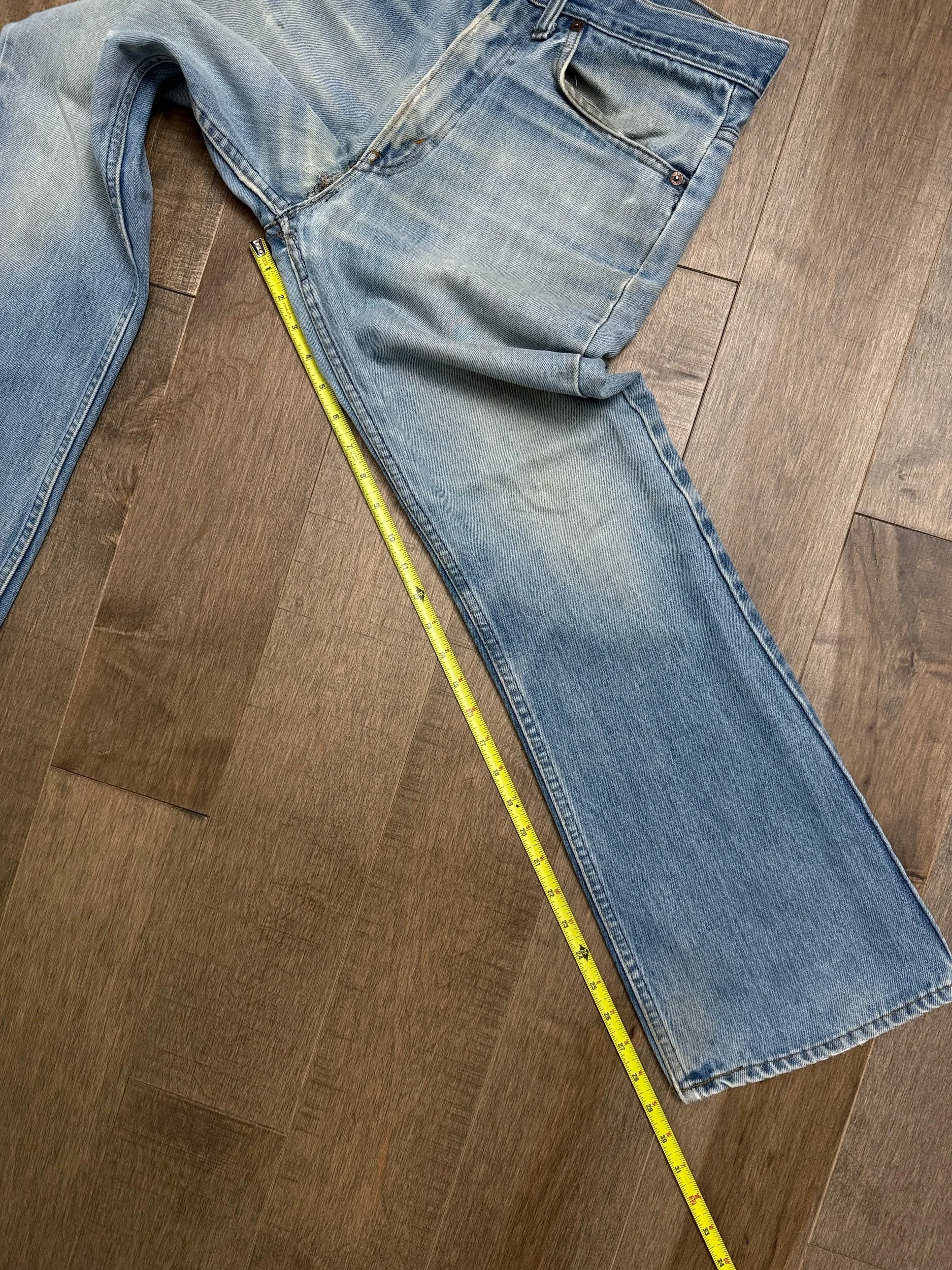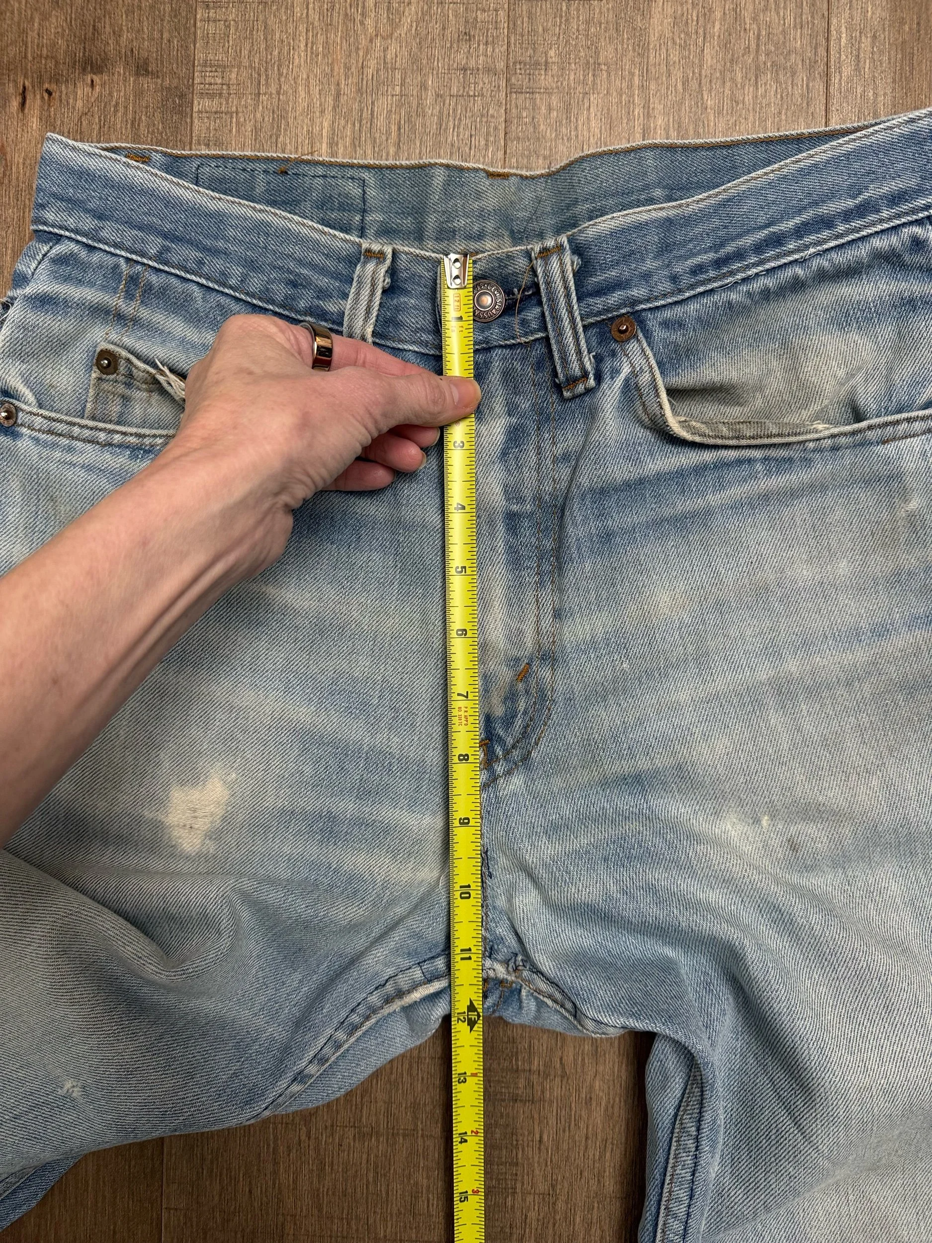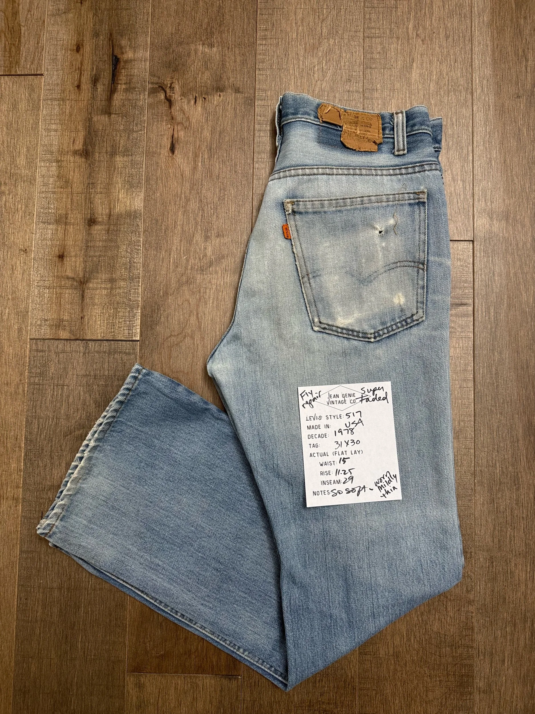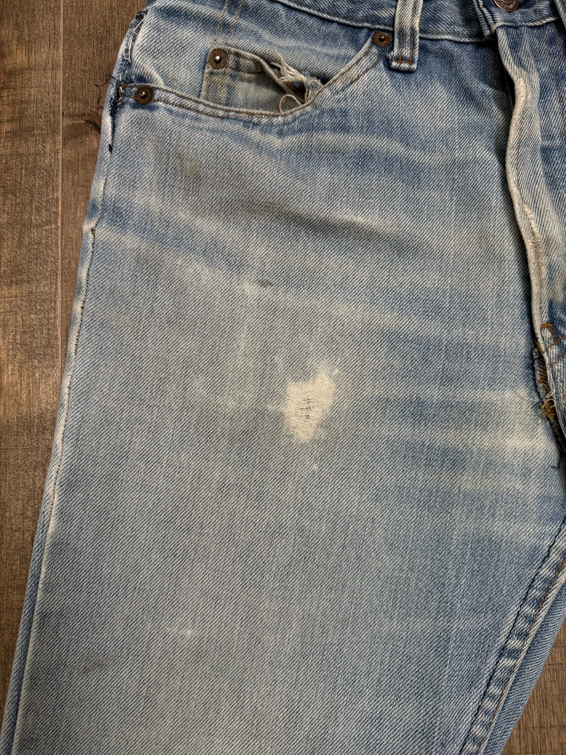 WASH: beautiful light blue wash with stunning organic sun fades, minor distress. Fly repair. So so soft!