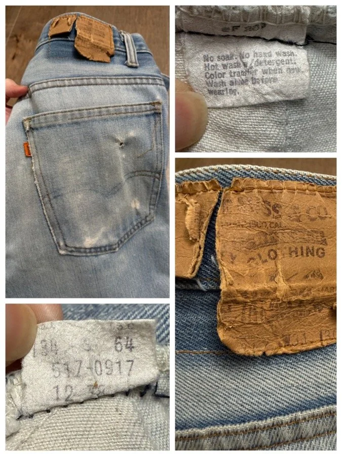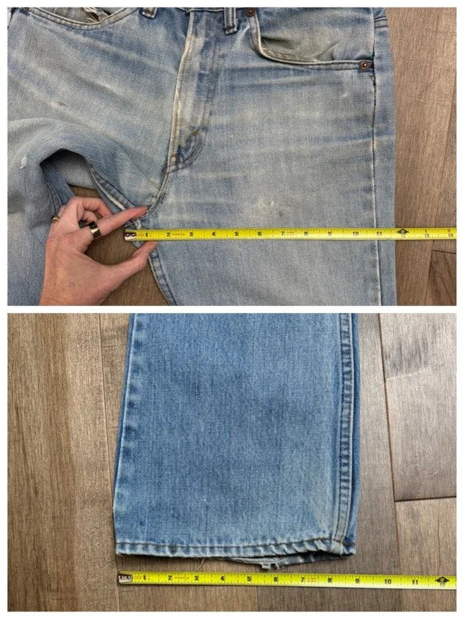 Keep in mind, vintage jeans are not new jeans. Every pair is at least 20 years old, most are older. This means they’ve been worn and likely have signs of wear - i.e. thinning areas, loose threads, signs of previous repair work, discolorations, faint (or not so faint stains), organic distressing, wear at the rivets, wear at the button holes. I do my best to describe these areas/signs of wear&tear, so please - before you buy - understand that you may receive your jeans and there will be signs of aging. Most buy vintage jeans wanting this, but if you want pristine new looking jeans, vintage likely isn’t for you. And that’s A-OK! Also note, the word “vintage” is not synonymous with super worn & faded. Vintage means over 20 years old. An item can be both vintage and still be new or like new condition.