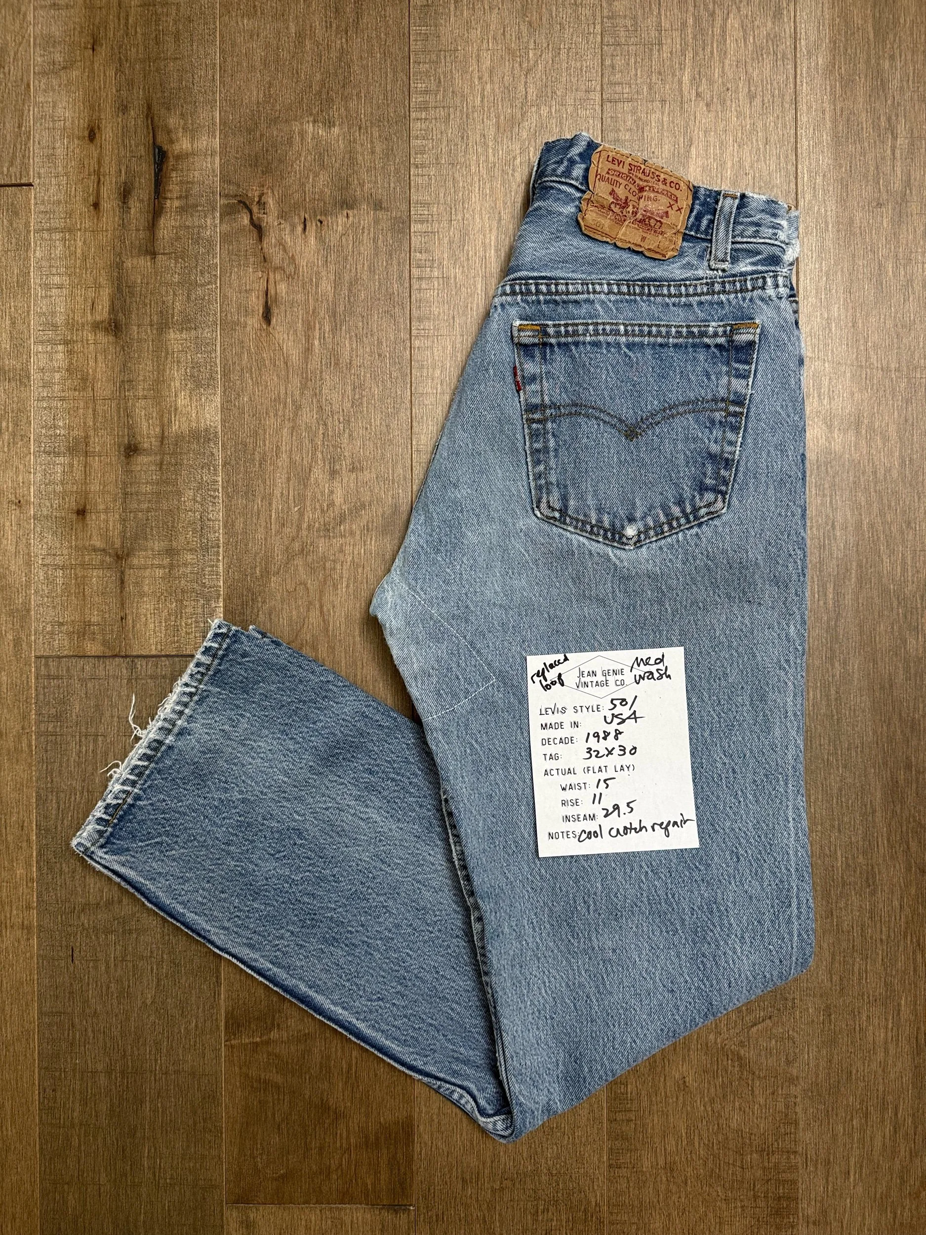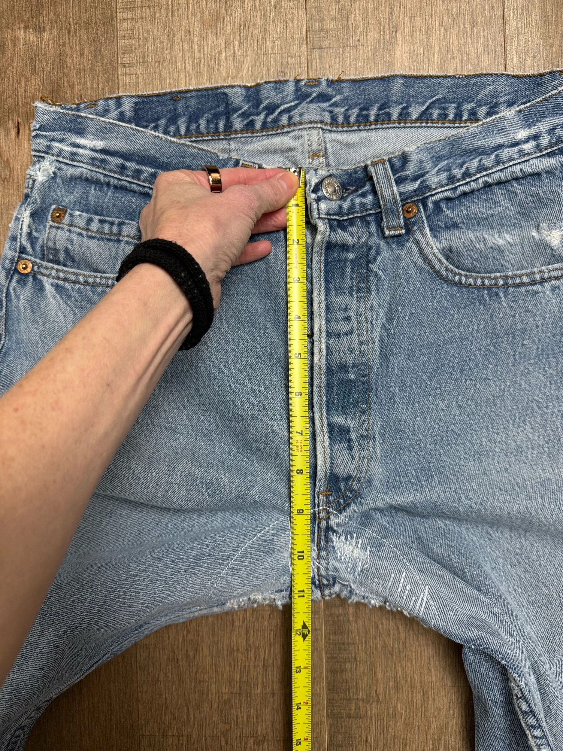 WASH: beautiful faded medium blue wash with cool wear and crotch/lower bum repair with patch inside. Visible stitching — adds character. Belt loop replaced.