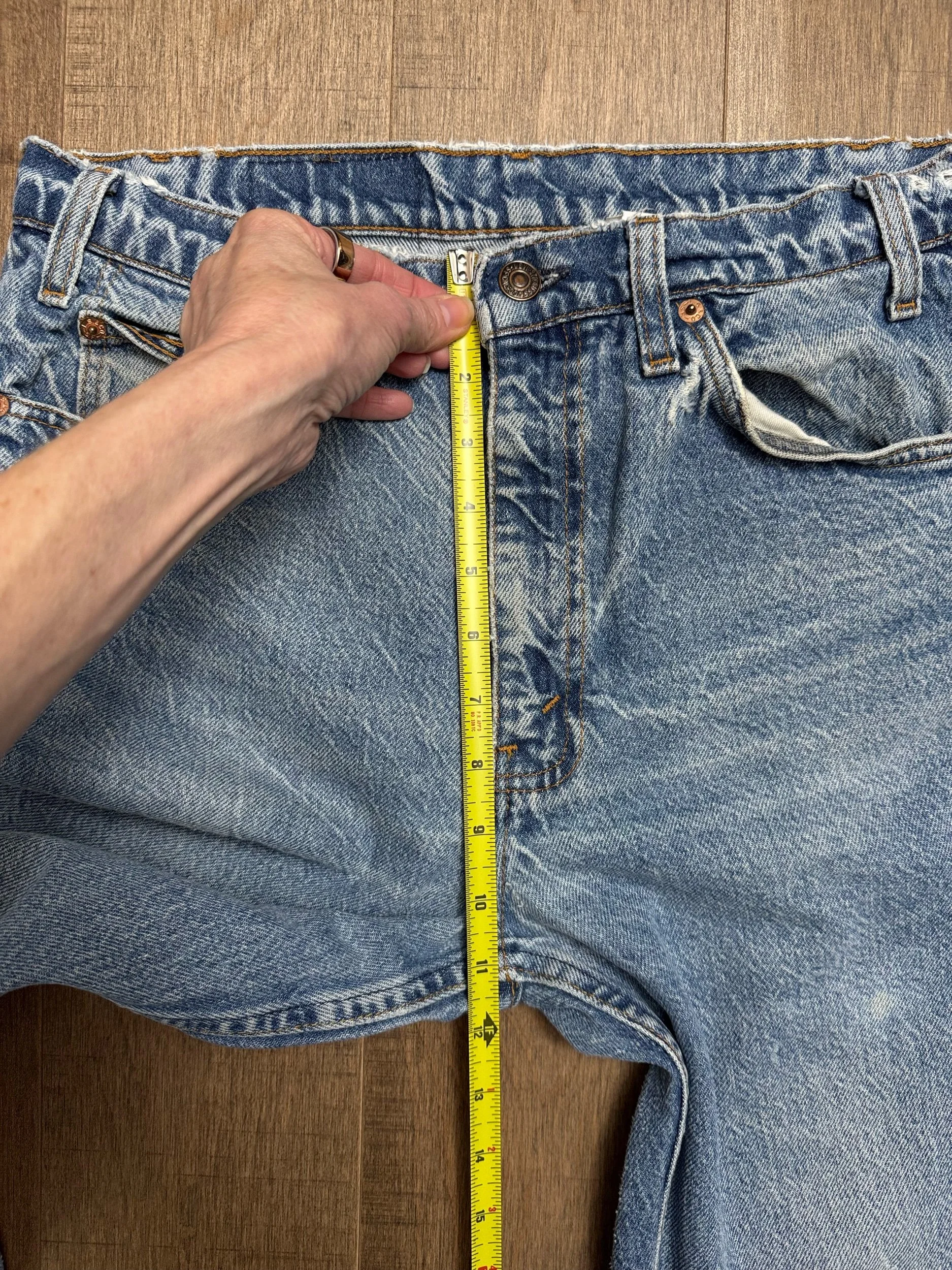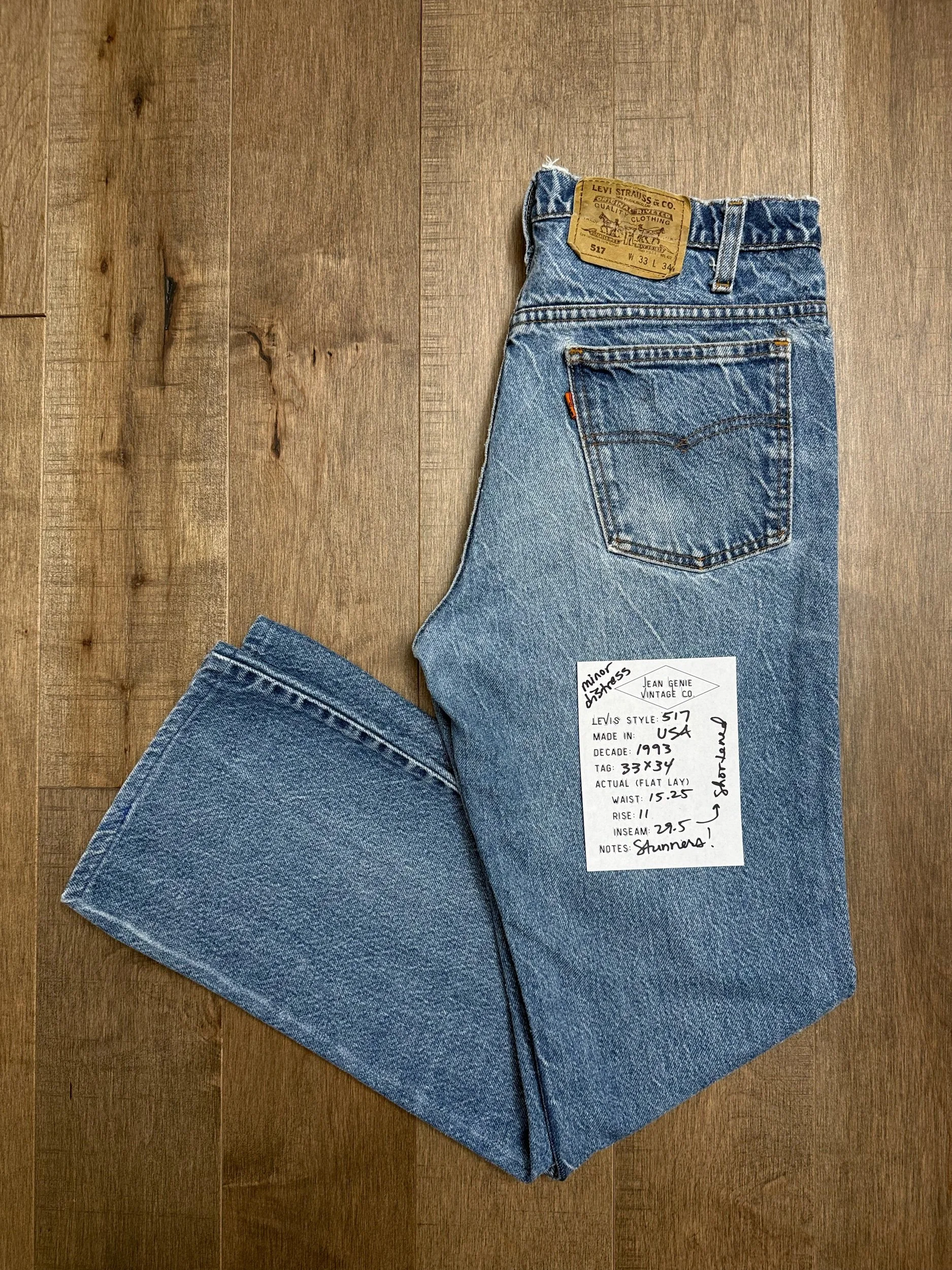 WASH: cool light medium blue wash with amazing organic sun fades, distressing at rivet insertion on back pockets, can be repaired for a small fee. These were shortened decades ago with natural wear at the bottoms.