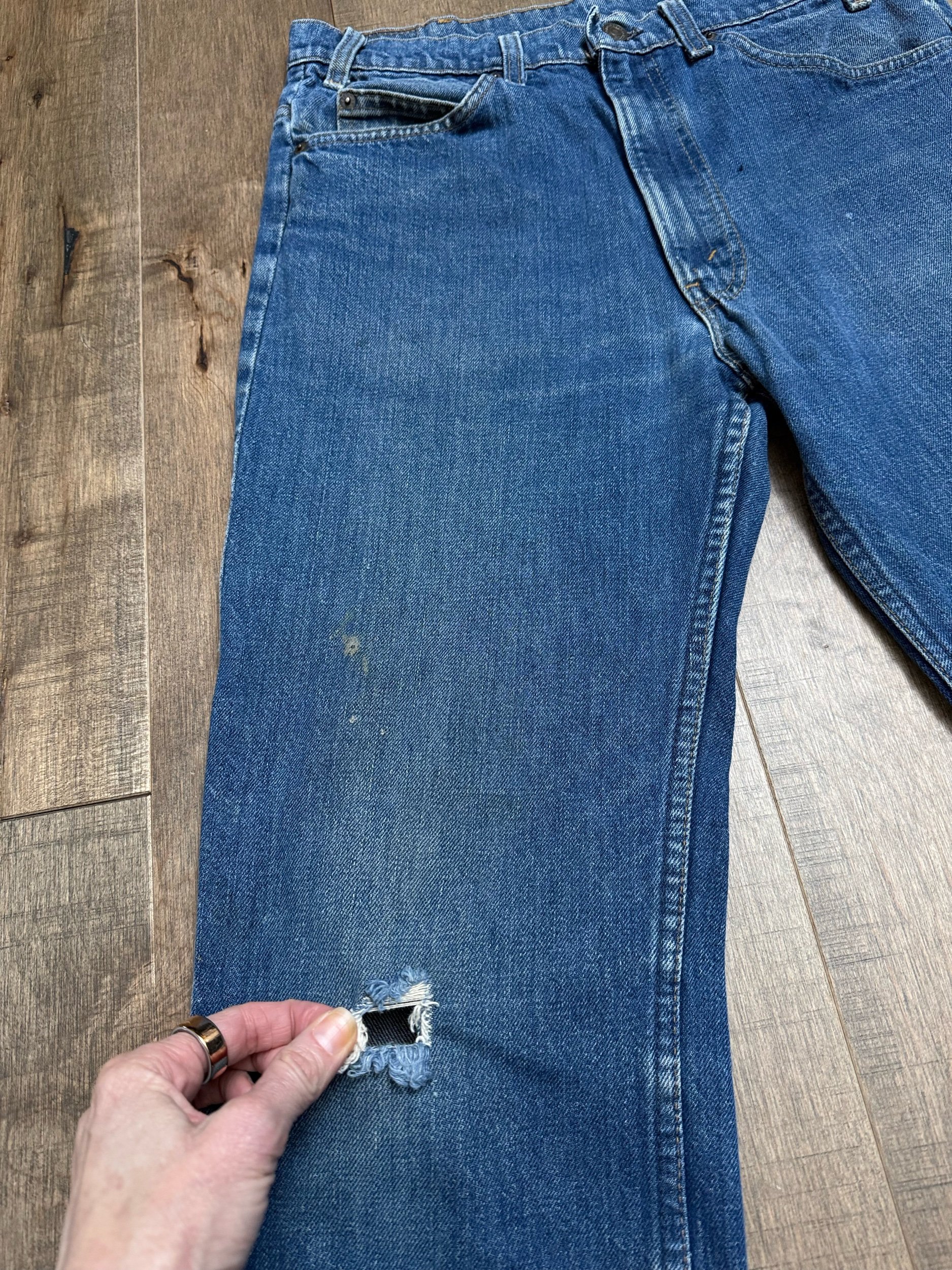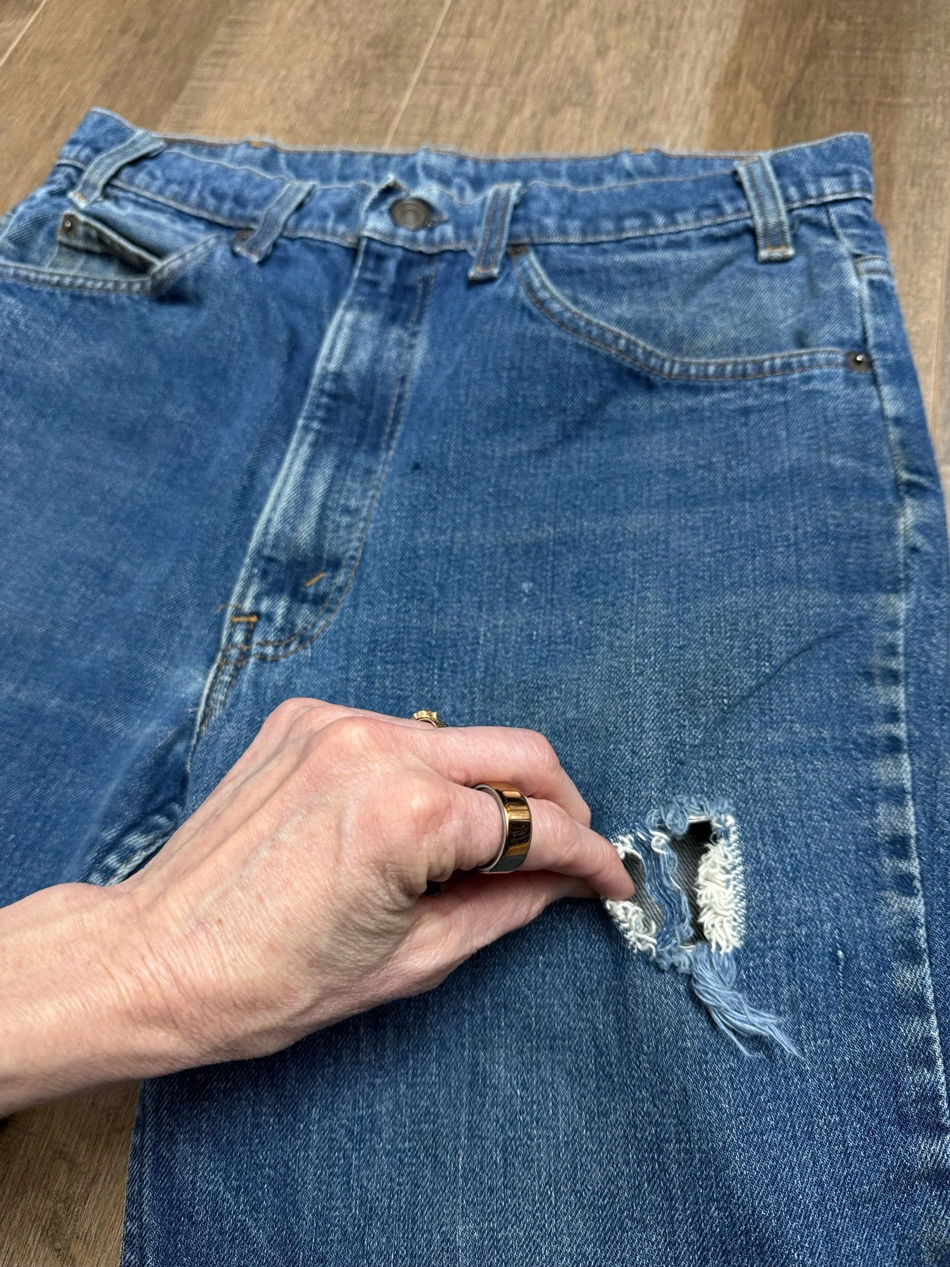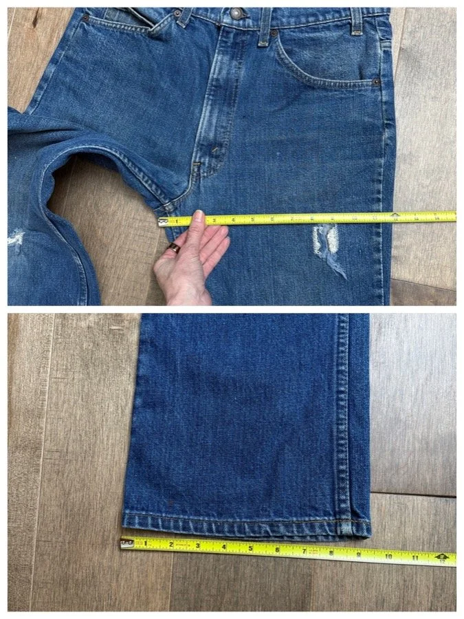 Keep in mind, vintage jeans are not new jeans. Every pair is at least 20 years old, most are older. This means they’ve been worn and likely have signs of wear - i.e. thinning areas, loose threads, signs of previous repair work, discolorations, faint (or not so faint stains), organic distressing, wear at the rivets, wear at the button holes. I do my best to describe these areas/signs of wear&tear, so please - before you buy - understand that you may receive your jeans and there will be signs of aging. Most buy vintage jeans wanting this, but if you want pristine new looking jeans, vintage likely isn’t for you. And that’s A-OK! Also note, the word “vintage” is not synonymous with super worn & faded. Vintage means over 20 years old. An item can be both vintage and still be new or like new condition.