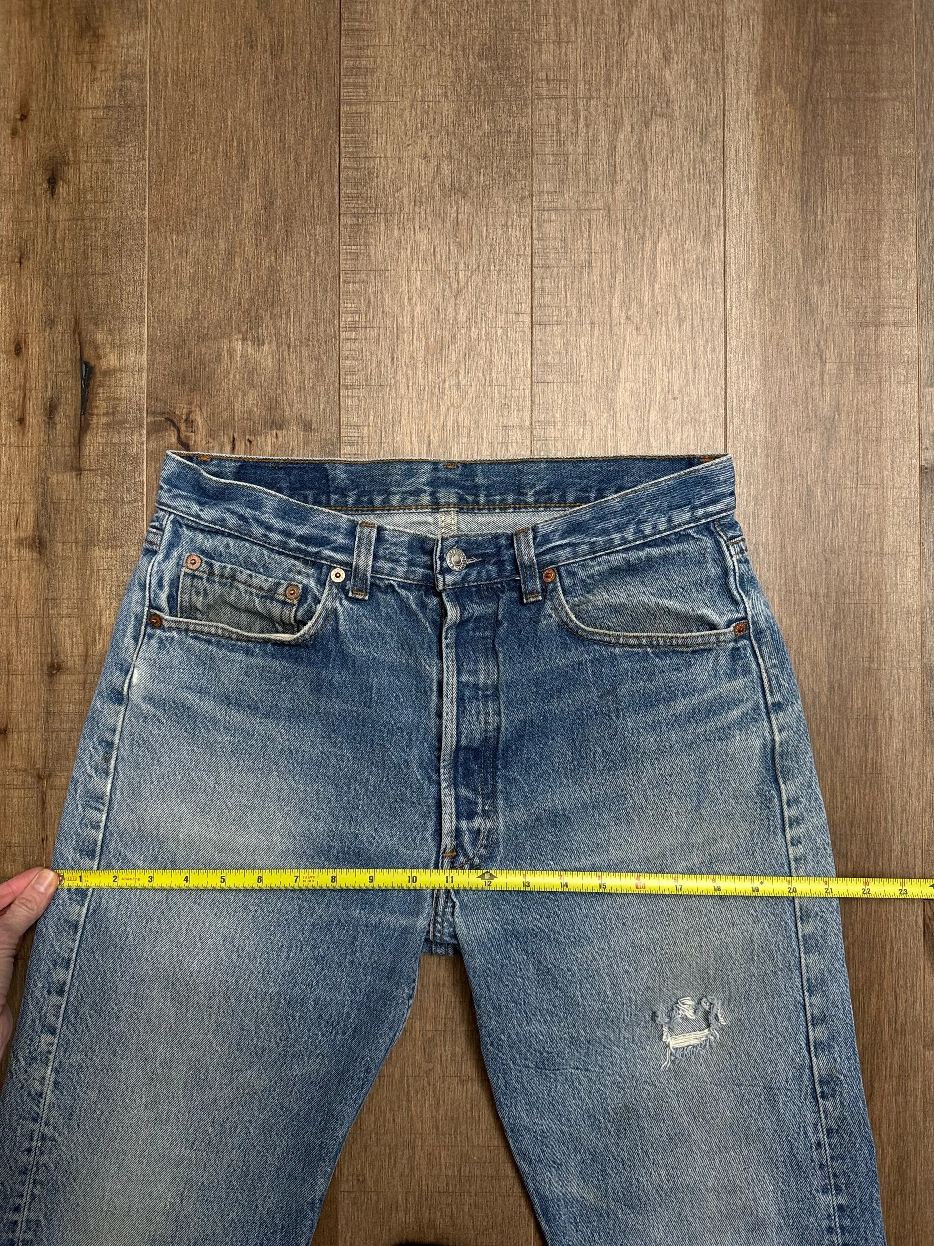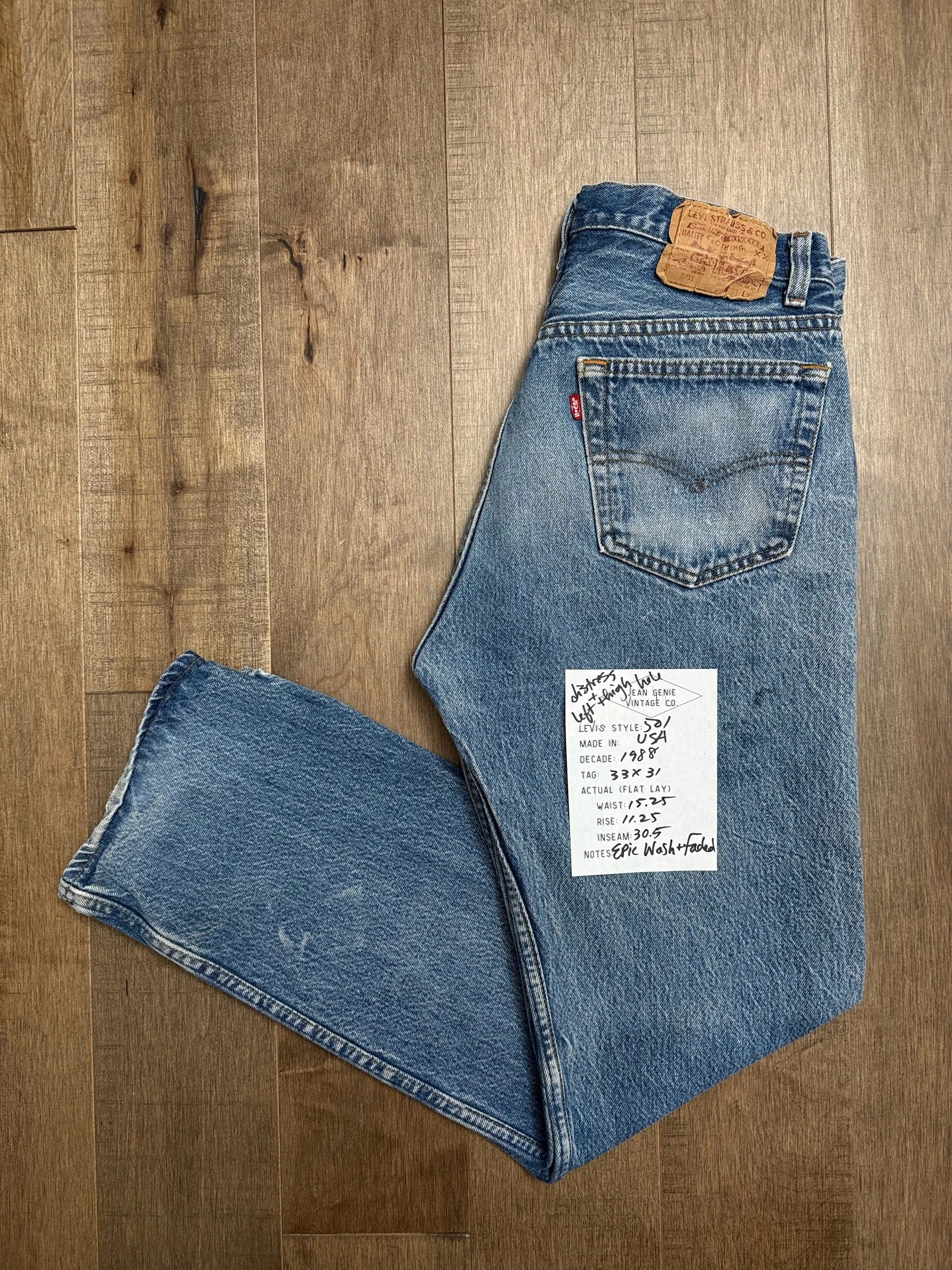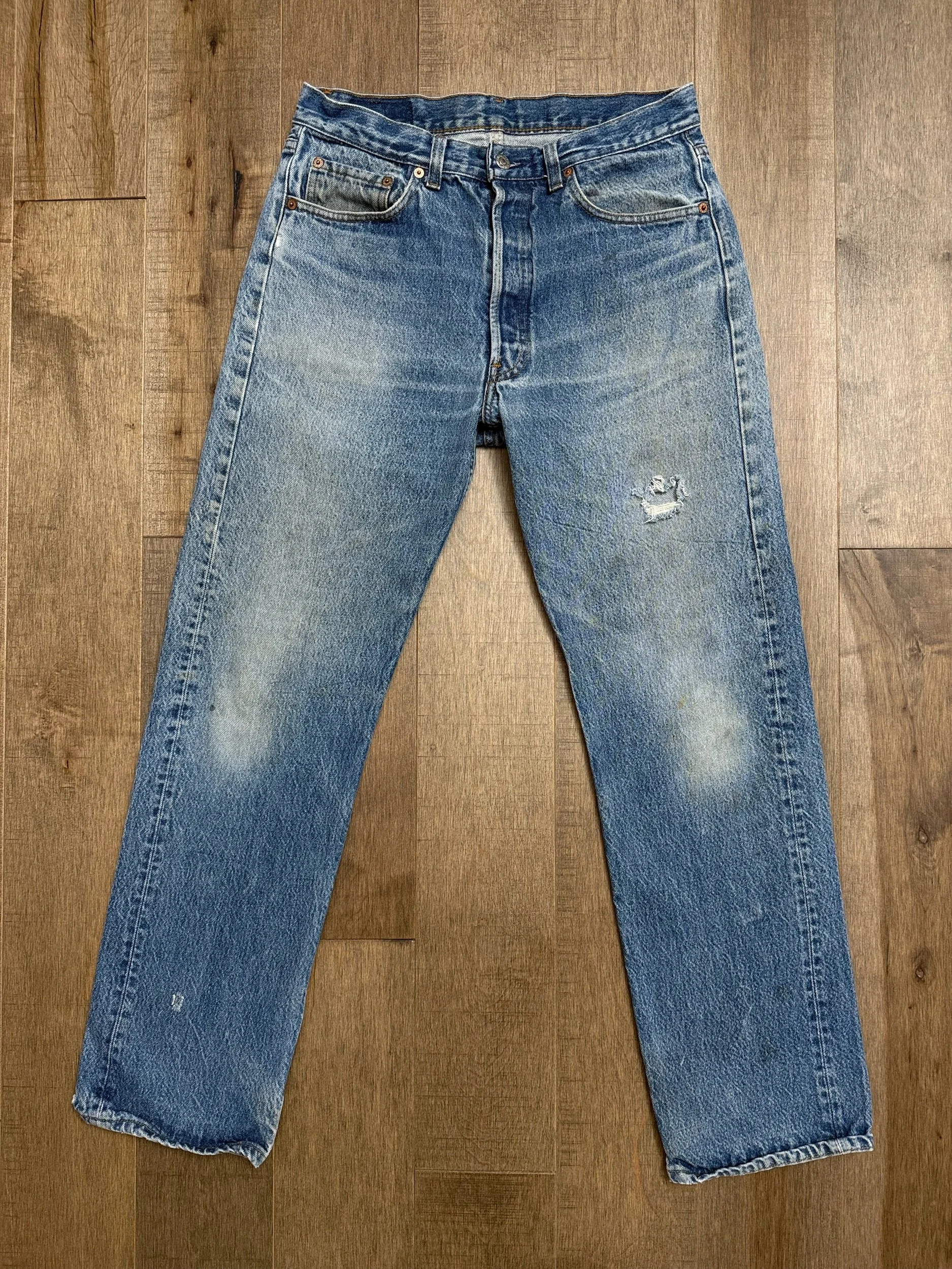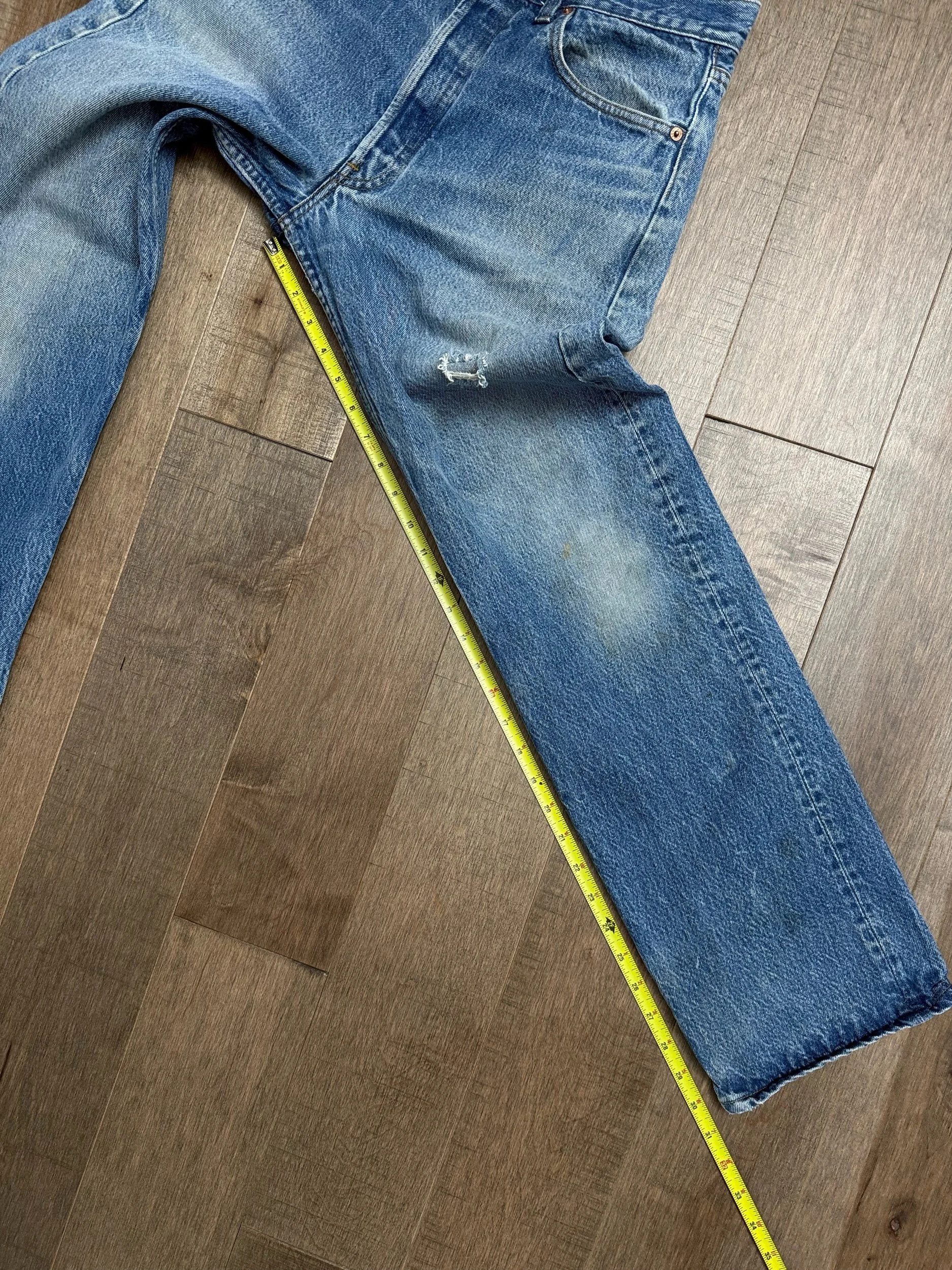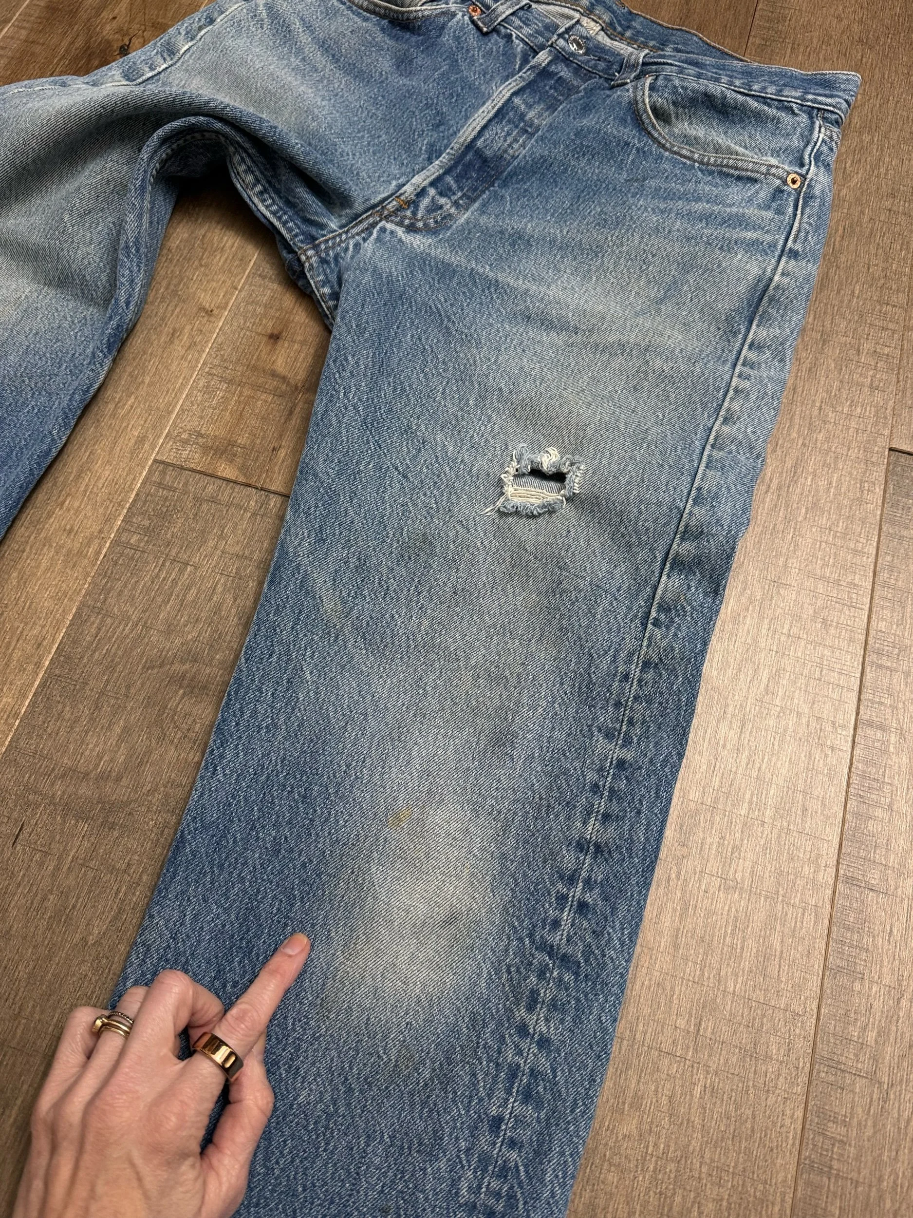 WASH: epic medium blue wash with the coolest organic sun fades and distress. Loads of character. Open hole on left thigh, can be patched for an additional small fee, just respond to your order confirmation email.