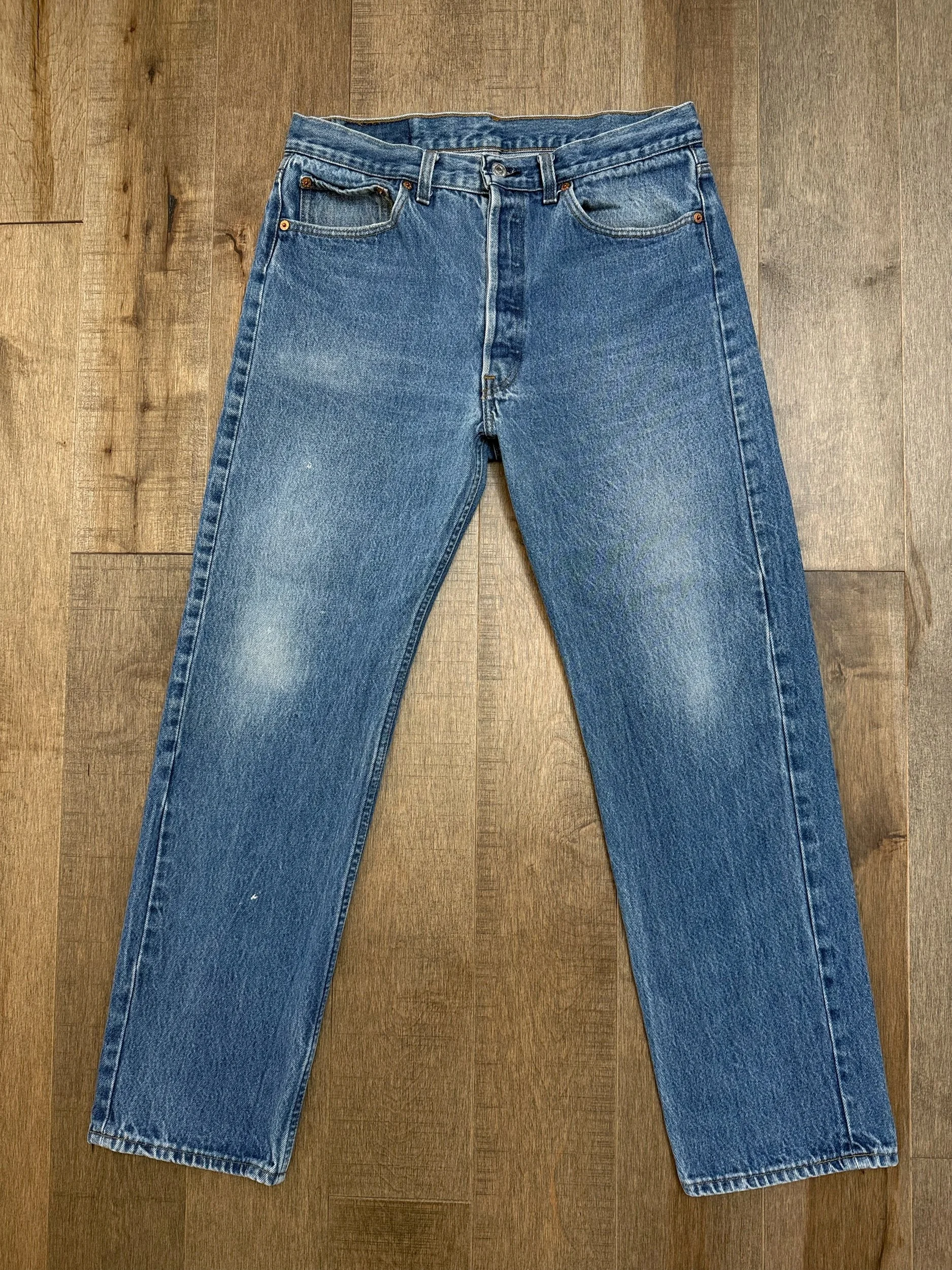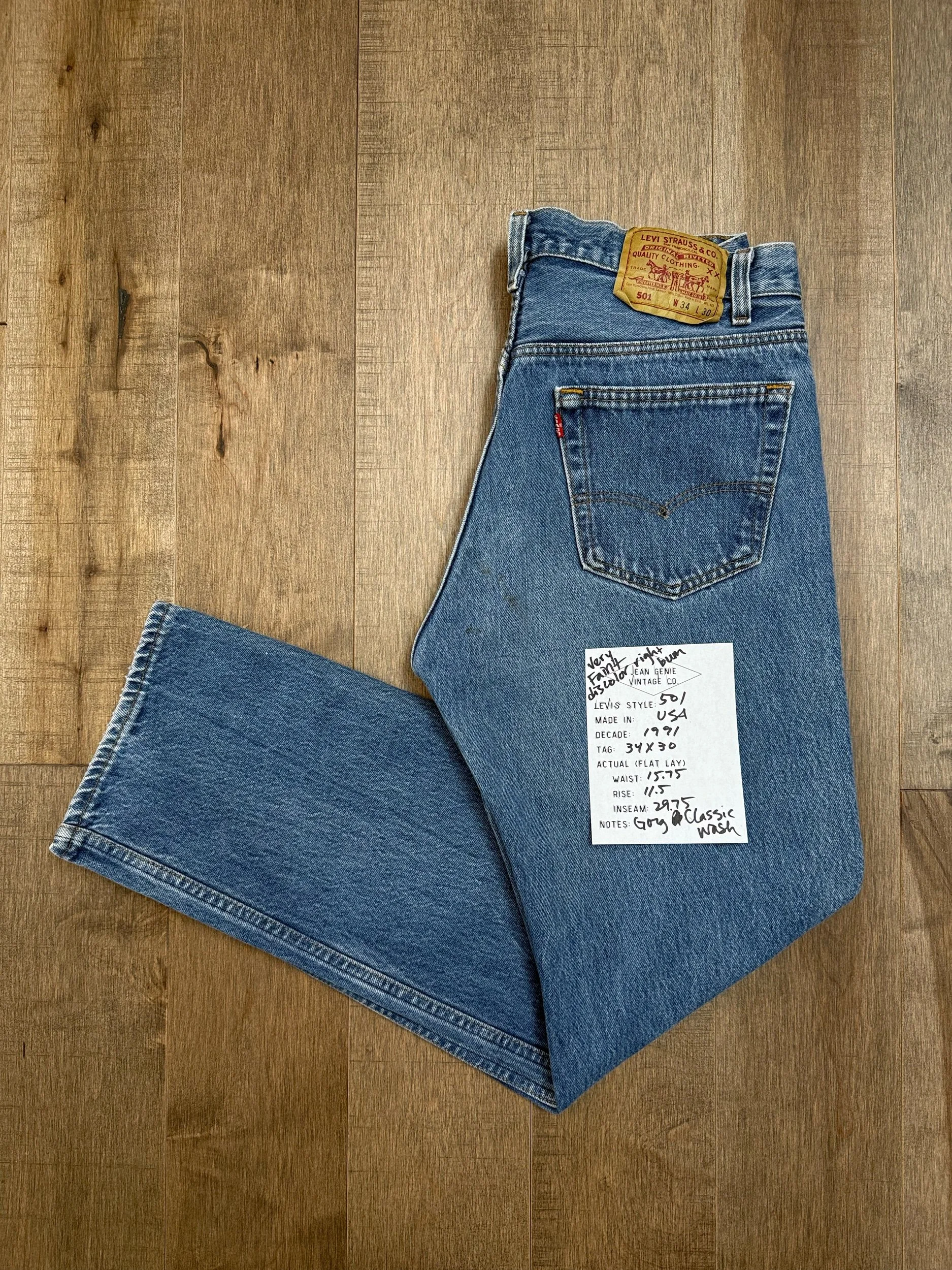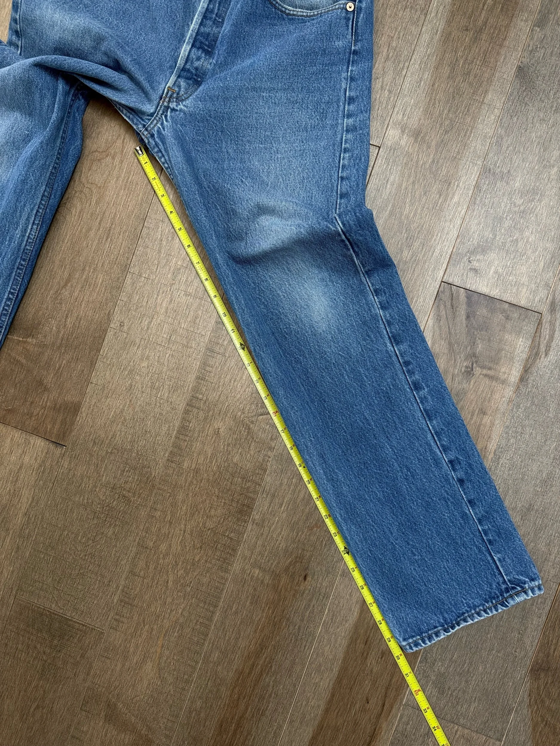 WASH: lovely classic medium blue wash with nice organic sun fades. VERY faint discoloration right bum, shown in pics, not very visible unless up close