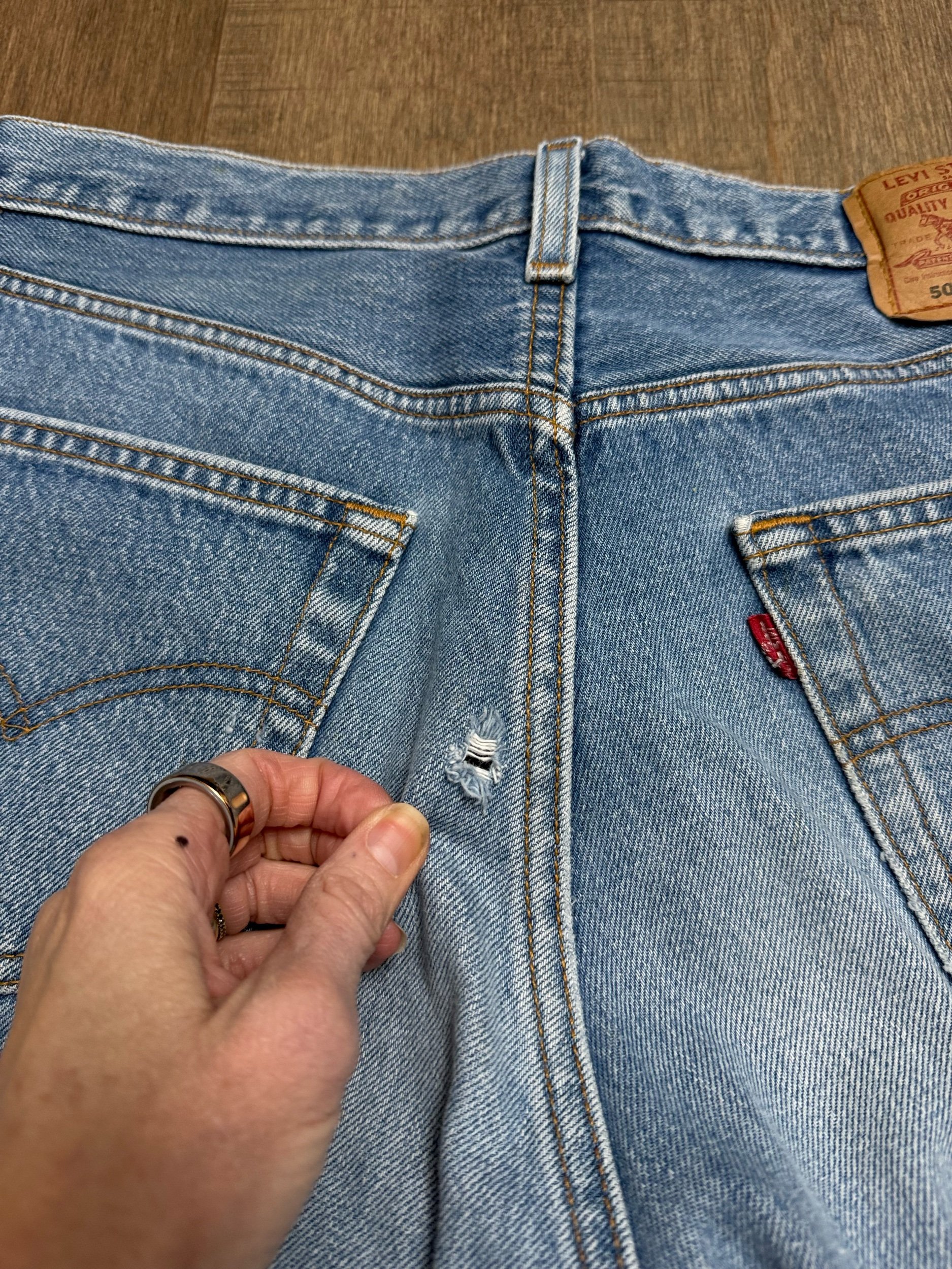 Sold as is. Keep in mind, vintage jeans are not new jeans. Every pair is at least 20 years old, most are older. This means they’ve been worn and likely have signs of wear - i.e. thinning areas, loose threads, signs of previous repair work, discolorations, faint (or not so faint stains), organic distressing, wear at the rivets, wear at the button holes. I do my best to describe these areas/signs of wear&tear, so please - before you buy - understand that you may receive your jeans and there will be signs of aging. Most buy vintage jeans wanting this, but if you want pristine new looking jeans, vintage likely isn’t for you. And that’s A-OK! Also note, the word “vintage” is not synonymous with super worn & faded. Vintage means over 20 years old. An item can be both vintage and still be new or like new condition.