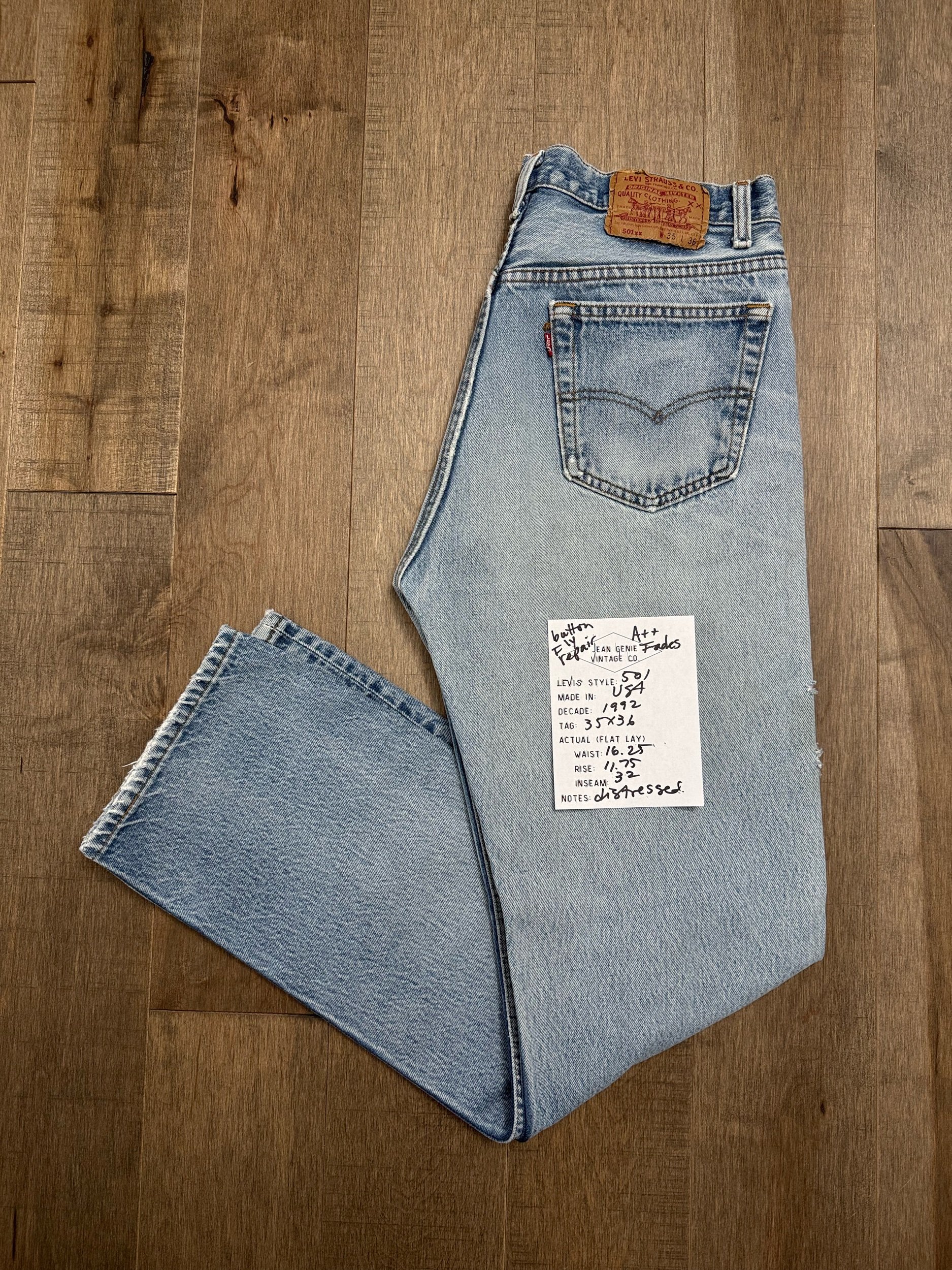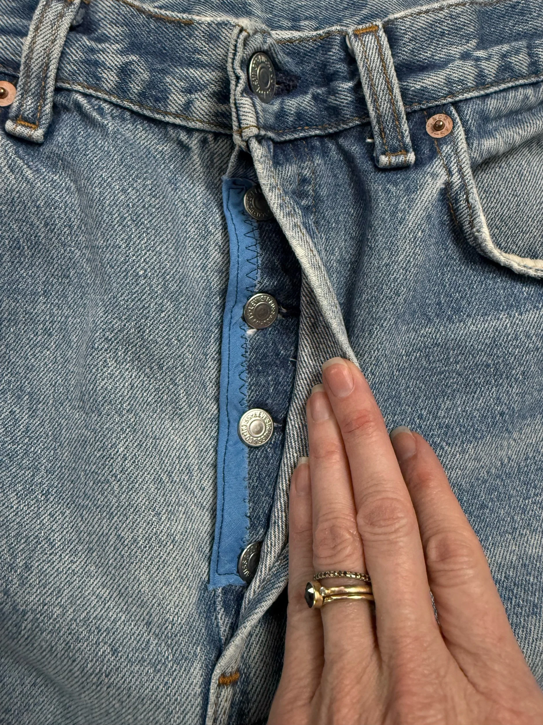 WASH: stunning light medium blue wash with perfect organic sun fades and cool distress. Button fly repair.