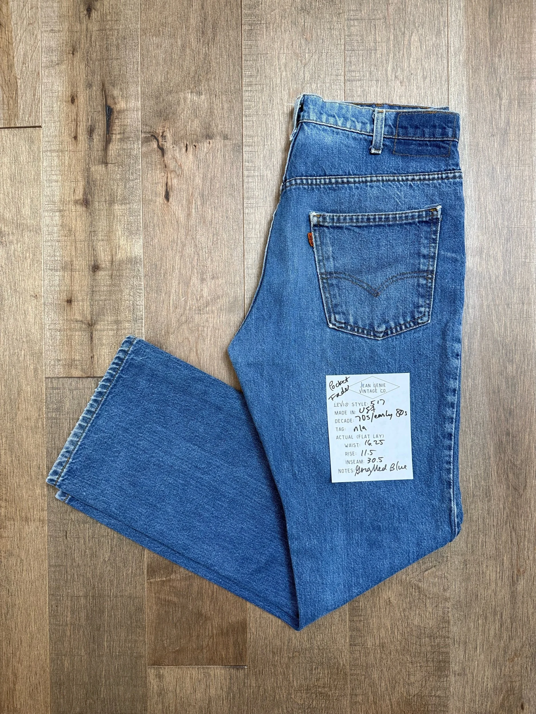 WASH: beautiful light medium blue wash with lovely organic sun fades & awesome pocket fade
