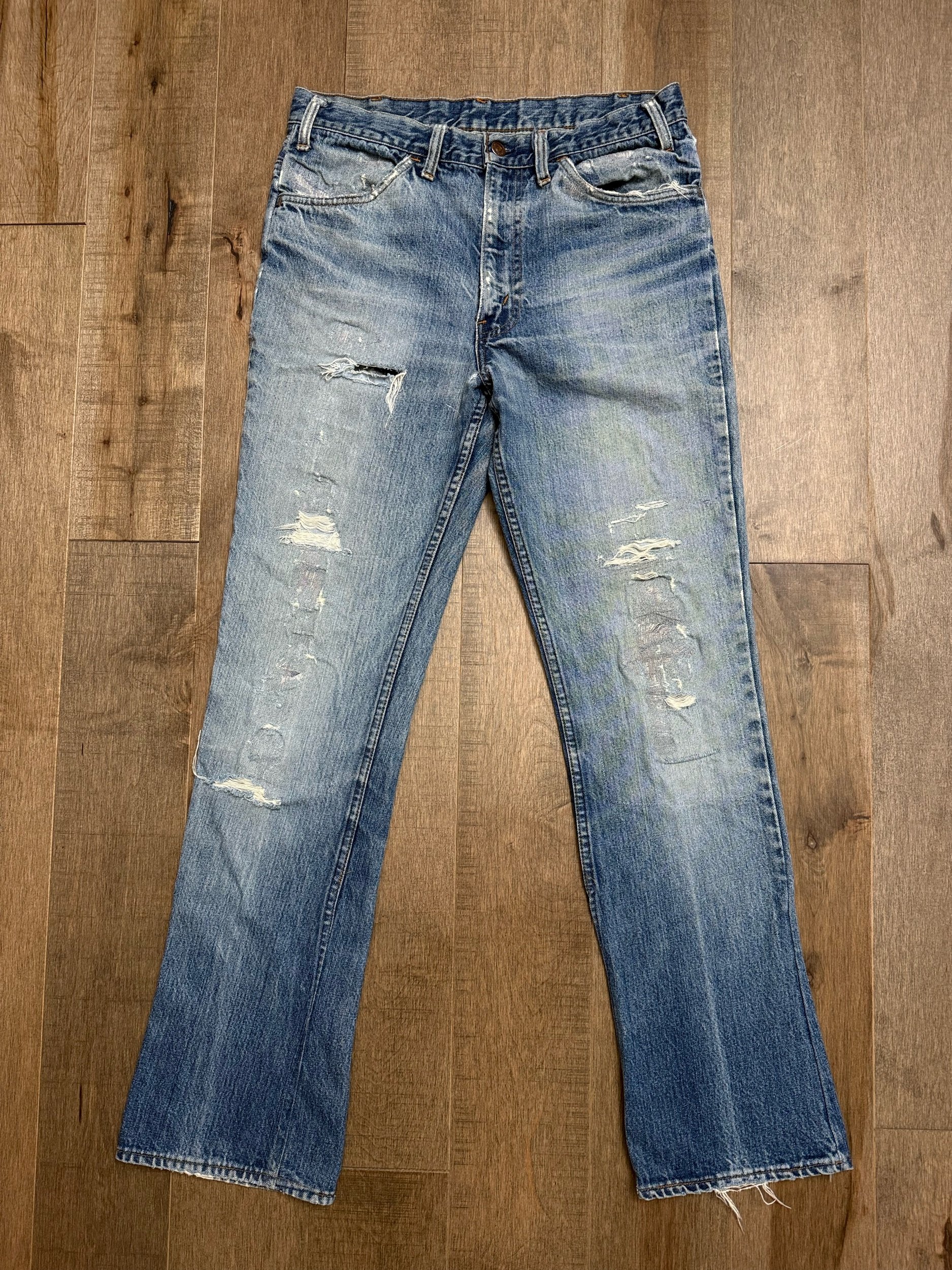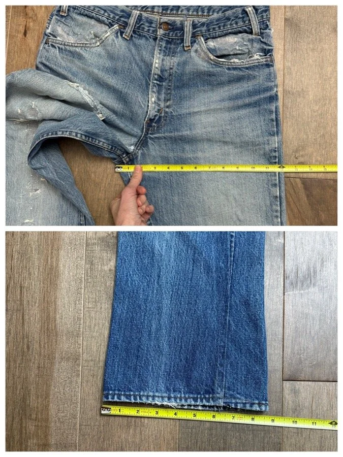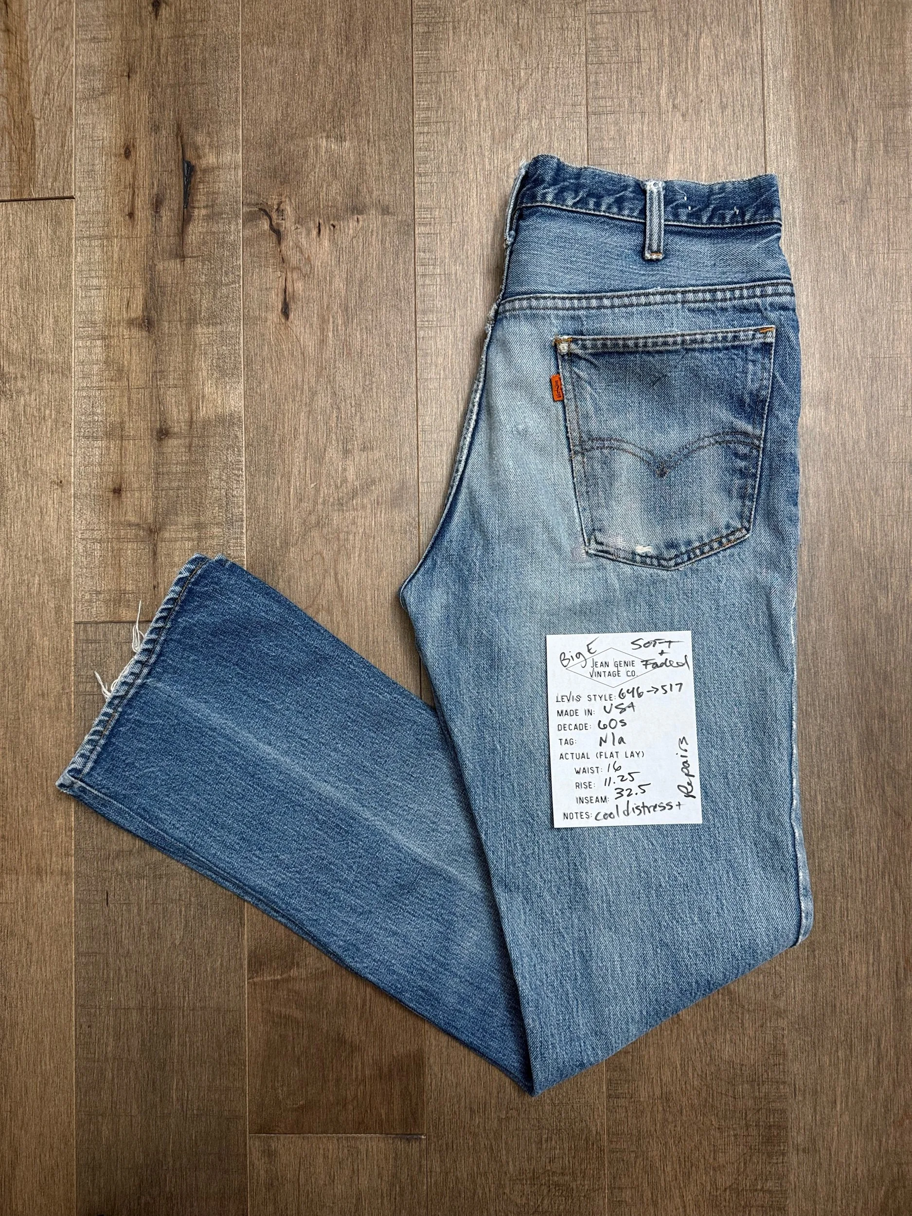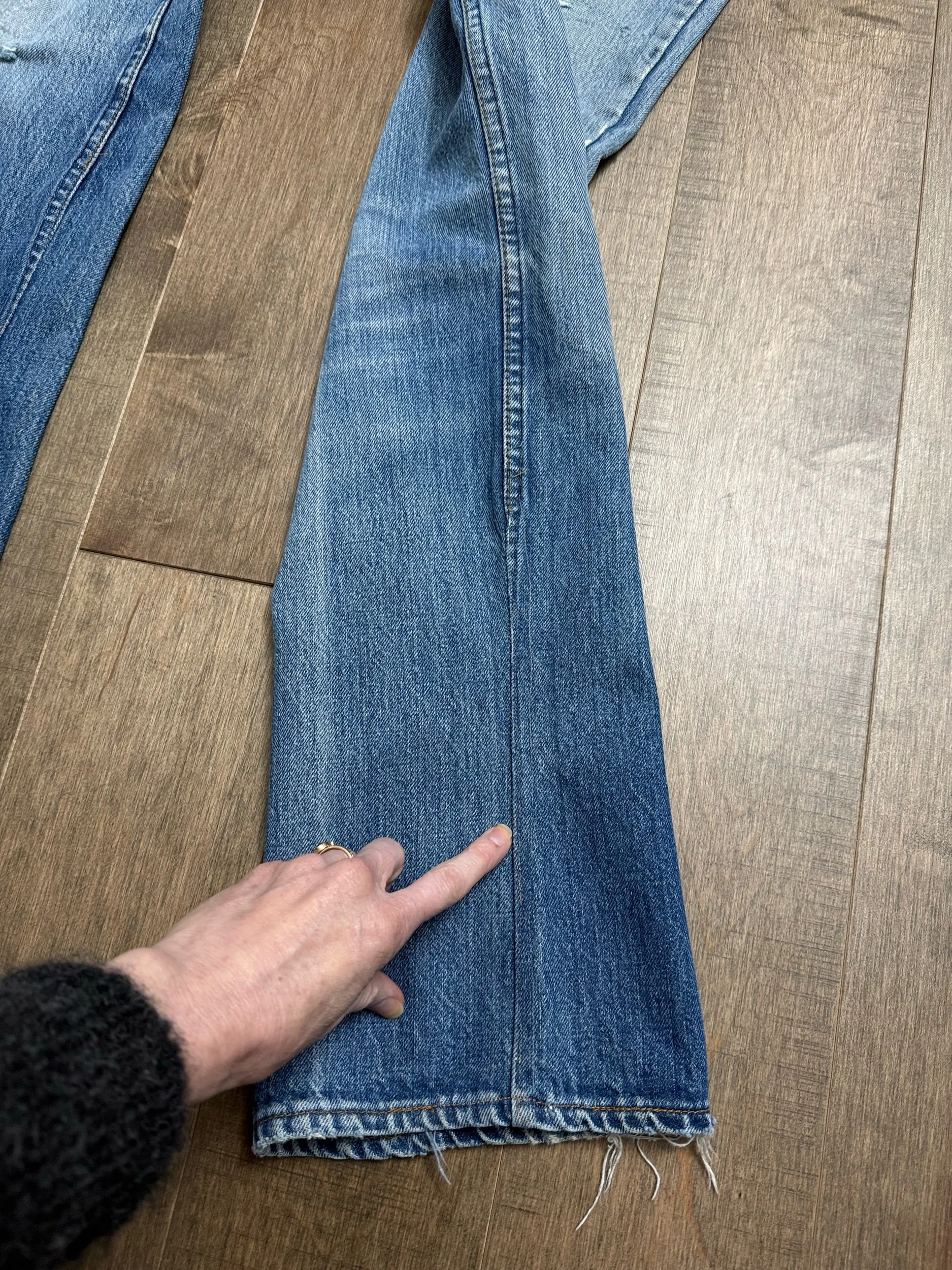 WASH: beautiful sun faded medium indigo blue wash with awesome organic sun fades, distress and repairs. Most of the distressing has been patched from the inside, or machine darned, but there are a few open, distressed areas as shown in the photos. Biggest thing to take away, is that the lower legs were altered to make them less flared and more like a 517 boot cut. You can see in the photos, the disruption of the original outer and inner seam on the lower legs. So if you like a 517, these are perfect for you! With that rare “big E” orange tab.