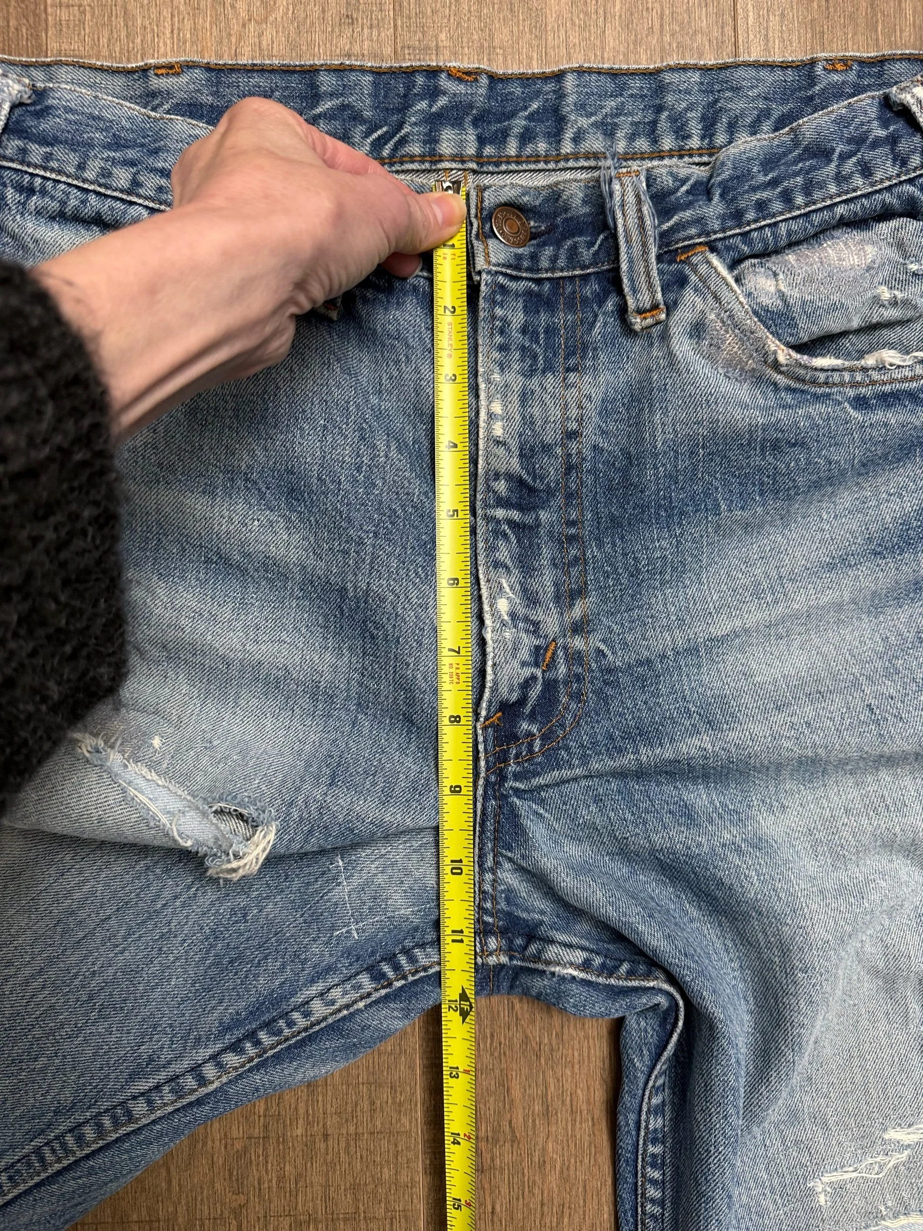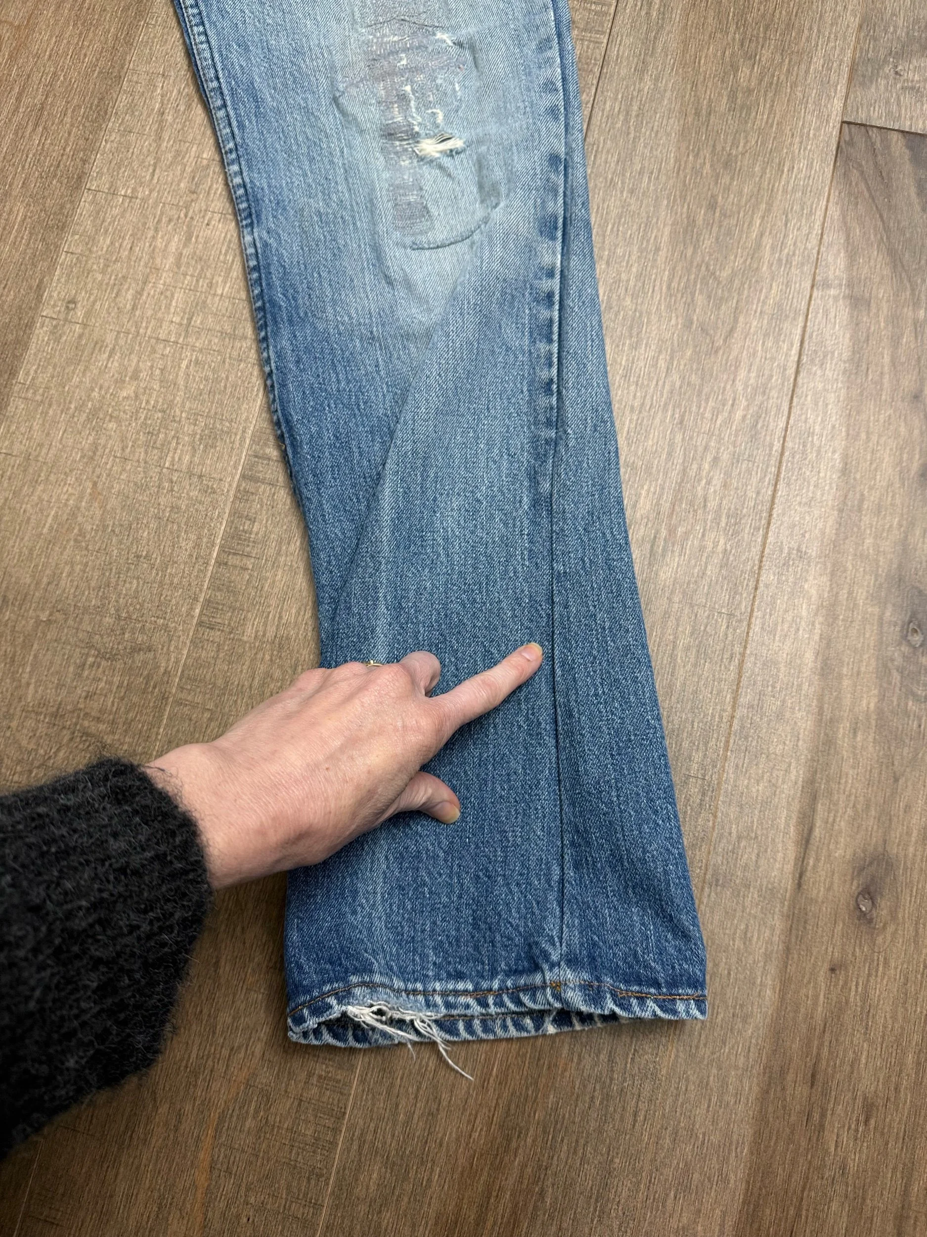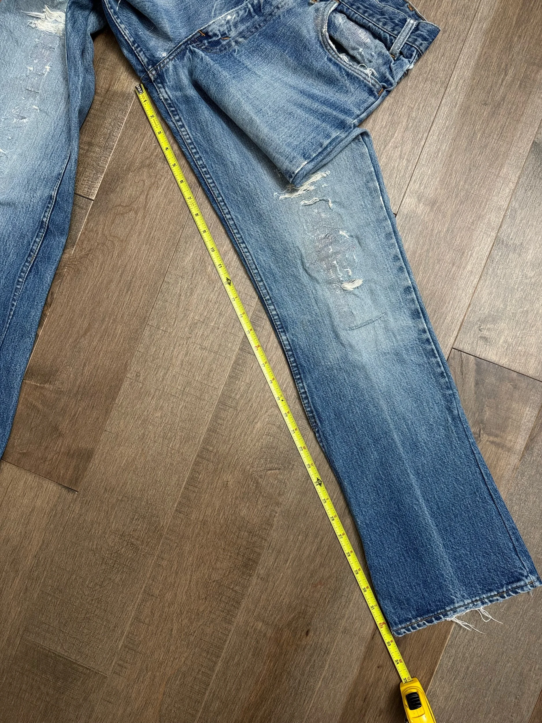 WASH: beautiful sun faded medium indigo blue wash with awesome organic sun fades, distress and repairs. Most of the distressing has been patched from the inside, or machine darned, but there are a few open, distressed areas as shown in the photos. Biggest thing to take away, is that the lower legs were altered to make them less flared and more like a 517 boot cut. You can see in the photos, the disruption of the original outer and inner seam on the lower legs. So if you like a 517, these are perfect for you! With that rare “big E” orange tab.