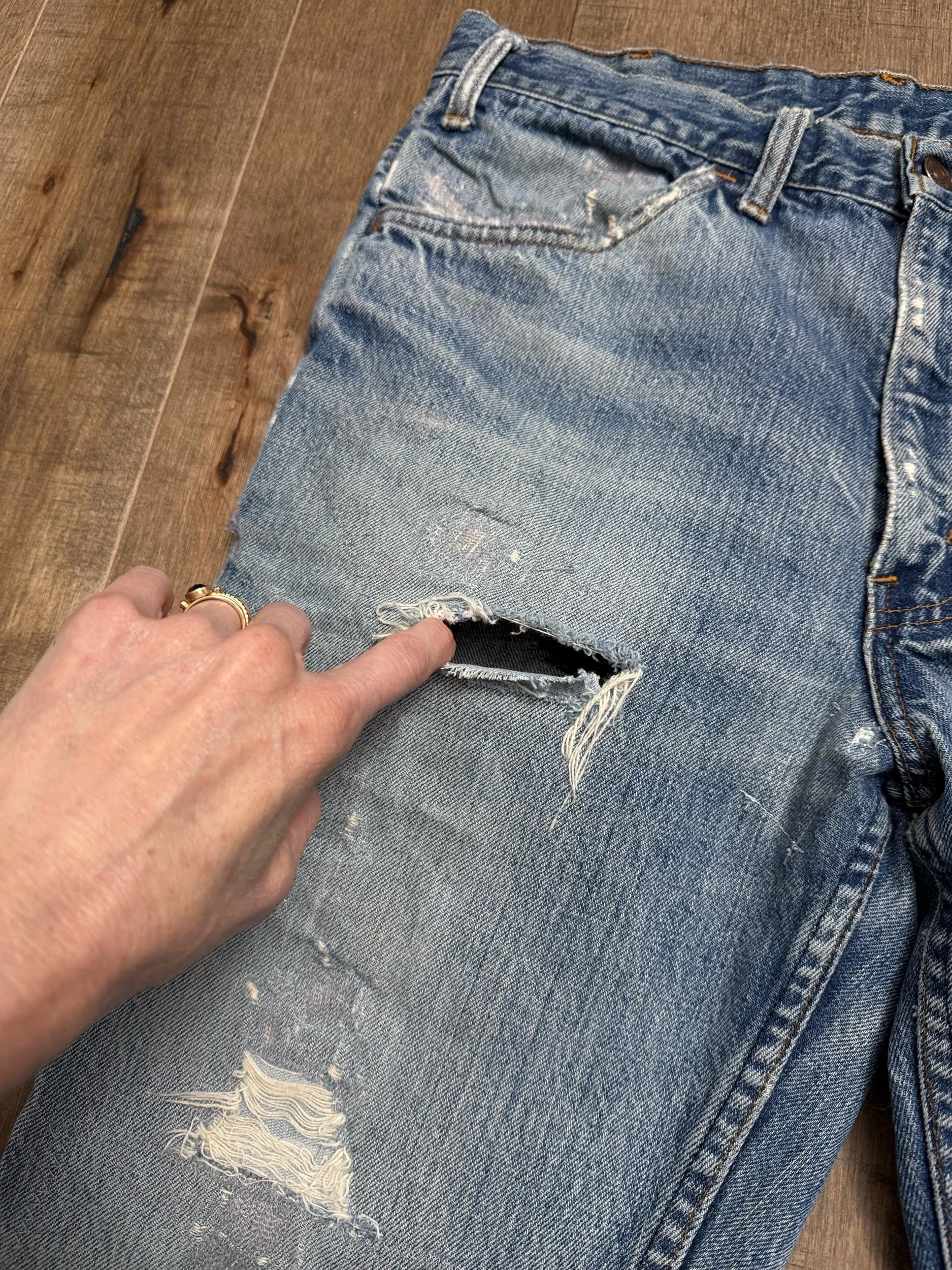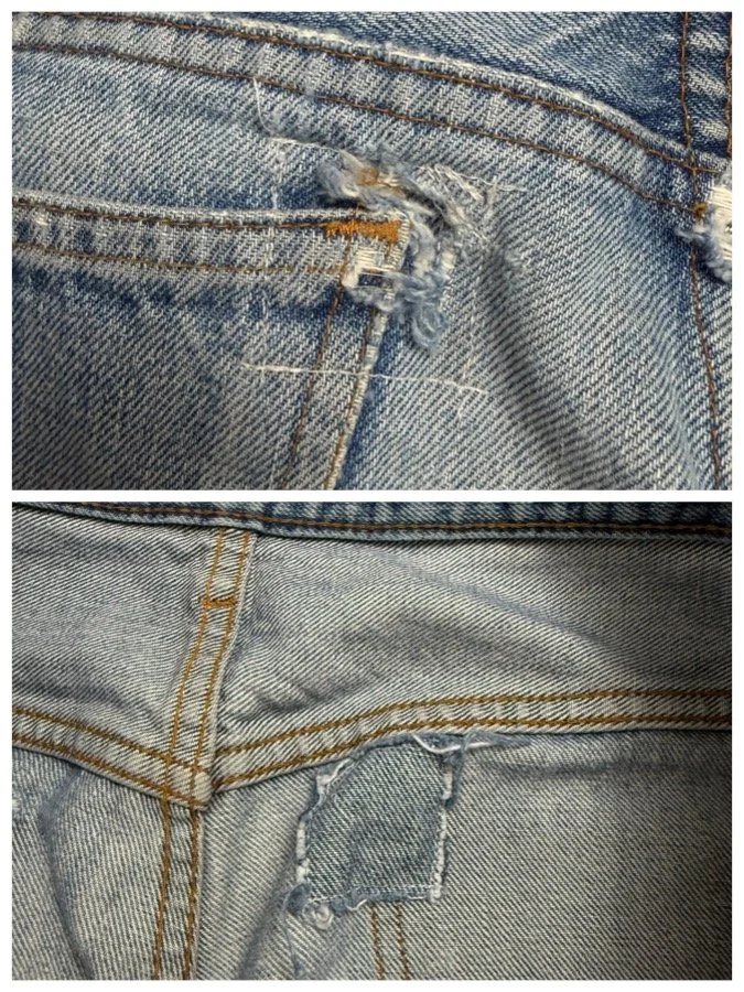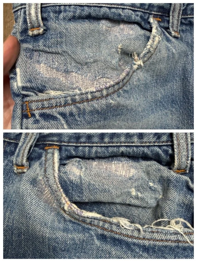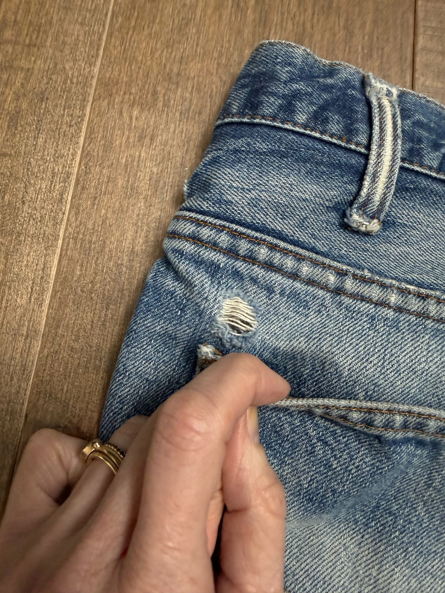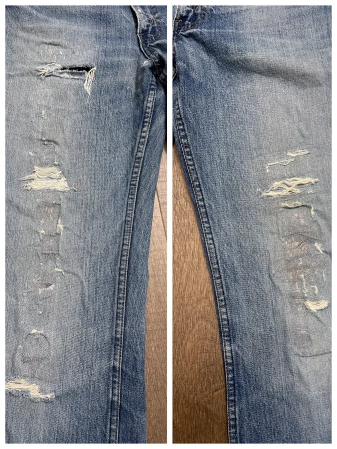 Keep in mind, vintage jeans are not new jeans. Every pair is at least 20 years old, most are older. This means they’ve been worn and likely have signs of wear - i.e. thinning areas, loose threads, signs of previous repair work, discolorations, faint (or not so faint stains), organic distressing, wear at the rivets, wear at the button holes. I do my best to describe these areas/signs of wear&tear, so please - before you buy - understand that you may receive your jeans and there will be signs of aging. Most buy vintage jeans wanting this, but if you want pristine new looking jeans, vintage likely isn’t for you. And that’s A-OK! Also note, the word “vintage” is not synonymous with super worn & faded. Vintage means over 20 years old. An item can be both vintage and still be new or like new condition.