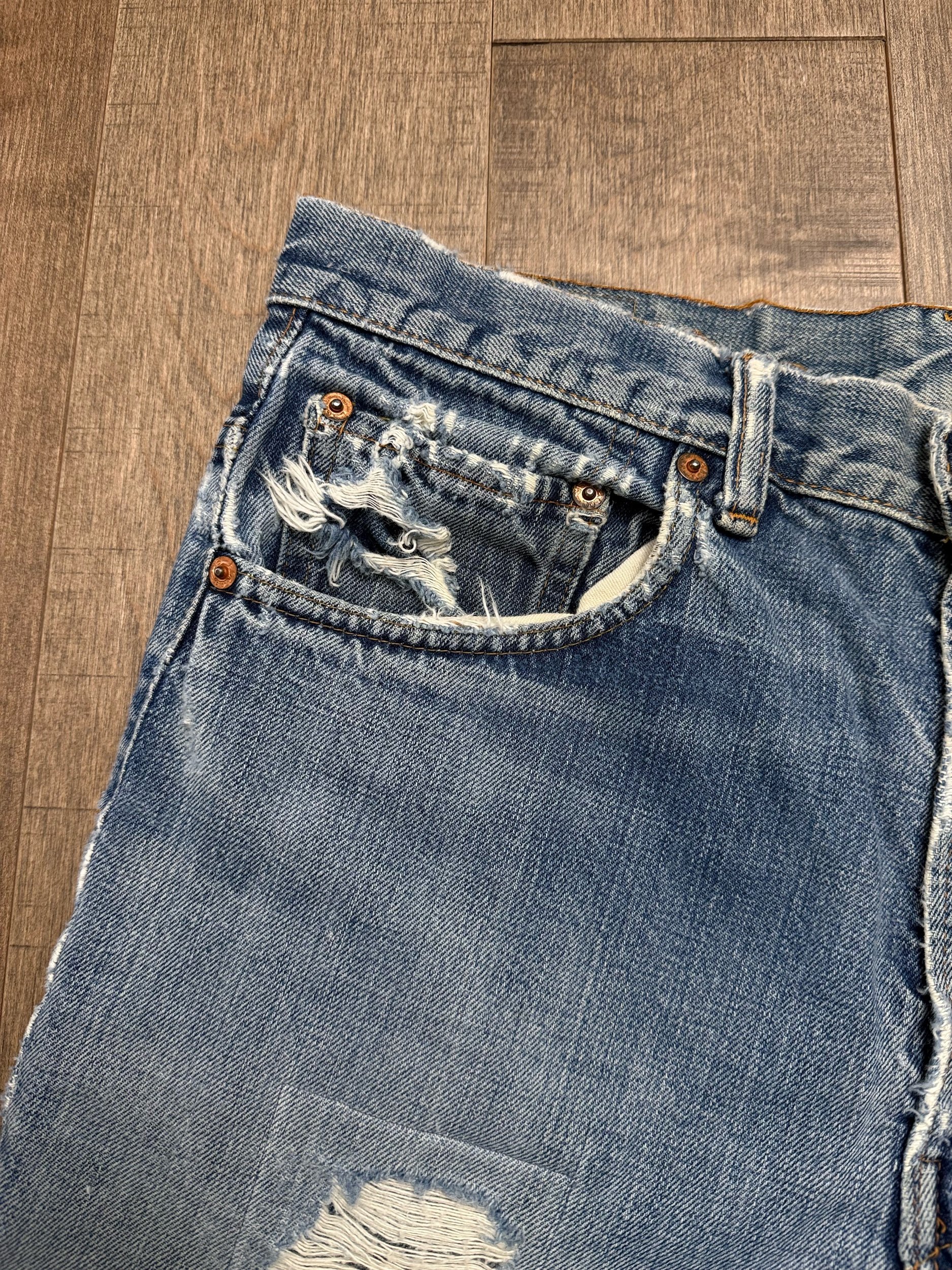WASH: epic super sun faded medium indigo blue wash with patched right thigh and crotch & rivet repairs.
