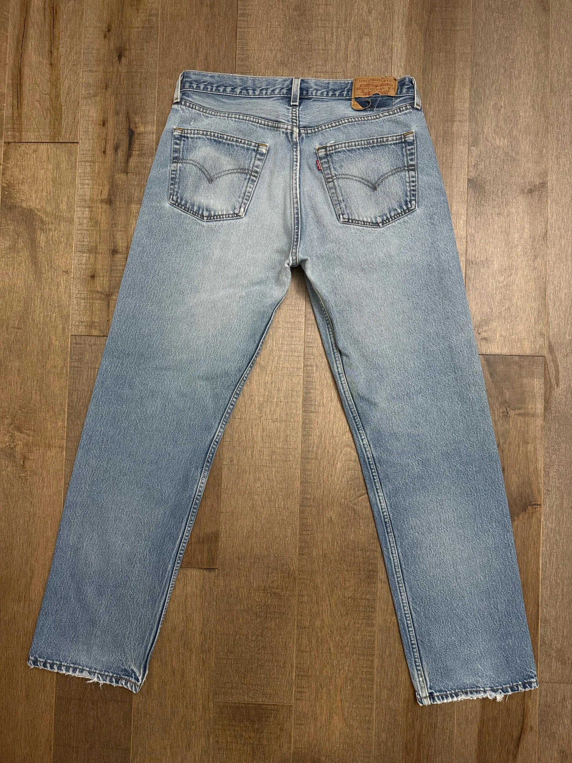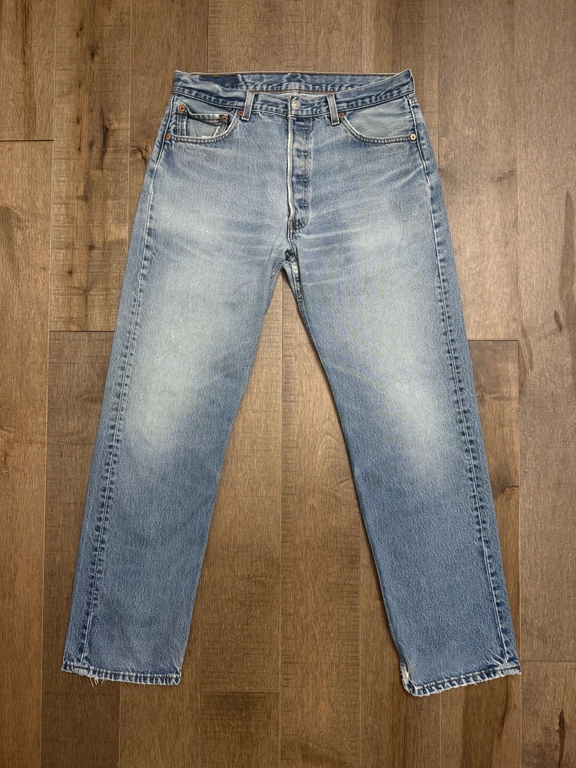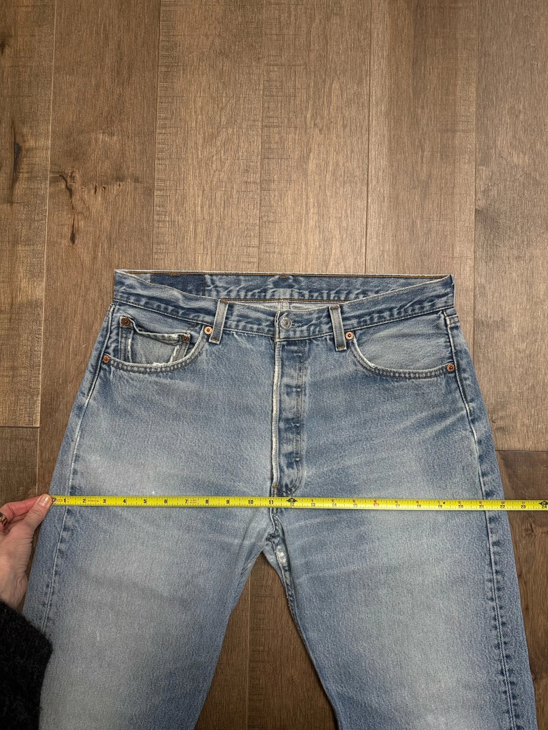 WASH: beautiful light medium blue wash with awesome organic sun fades, thin spot lower bum. Rivet repair. Soft & worn!
