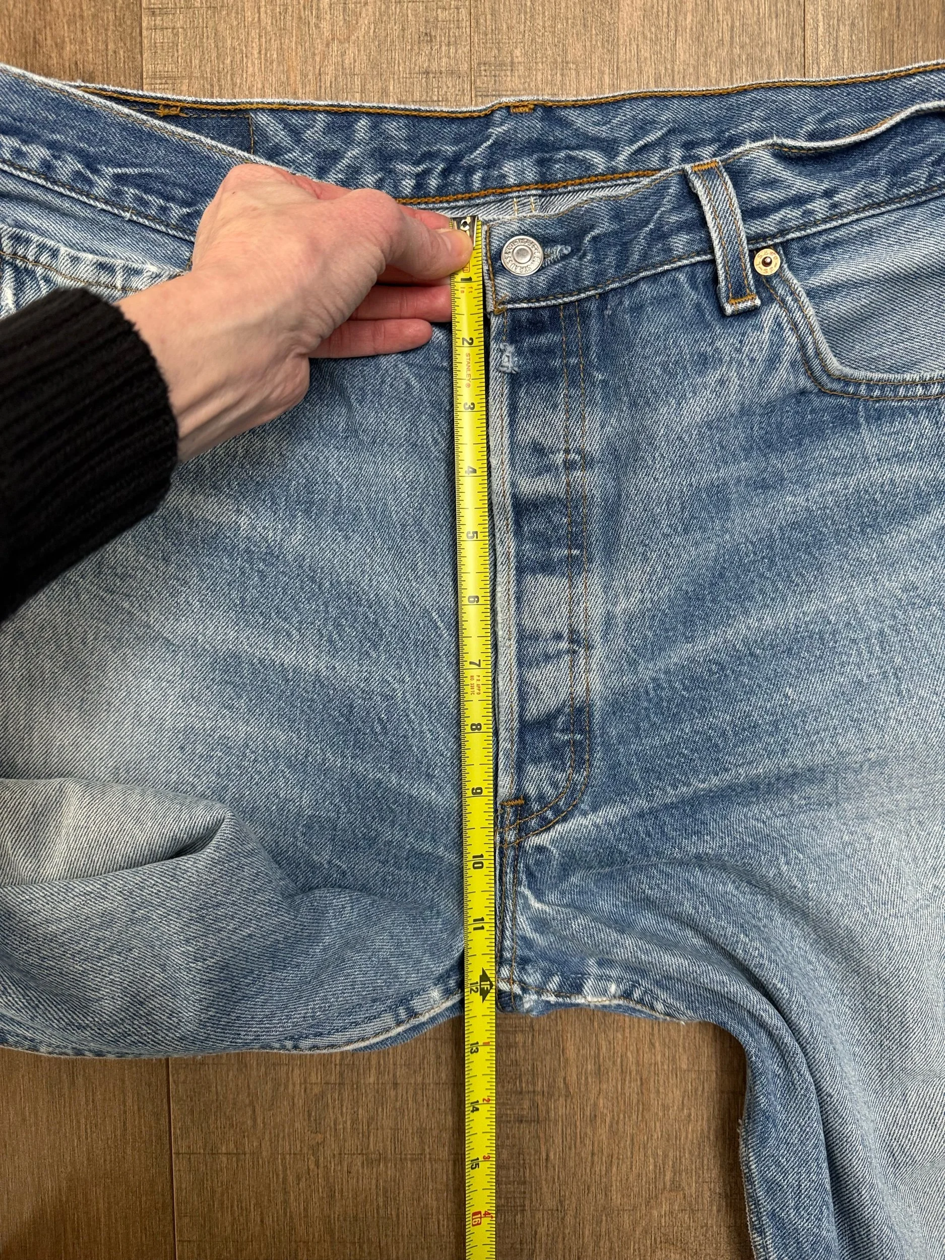 WASH: beautiful light medium blue wash with epic organic sun fades, faint lower hem discoloration