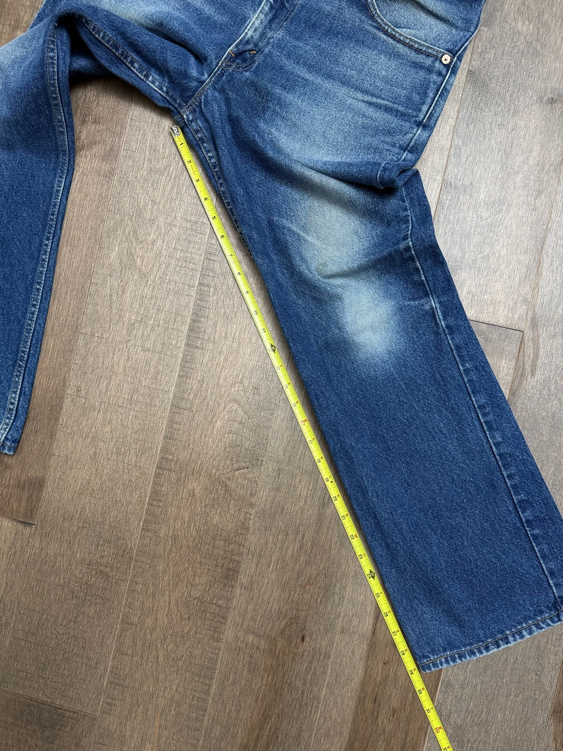 WASH: gorgeous dark blue wash with epic organic fades. knee discoloration as shown in photos.