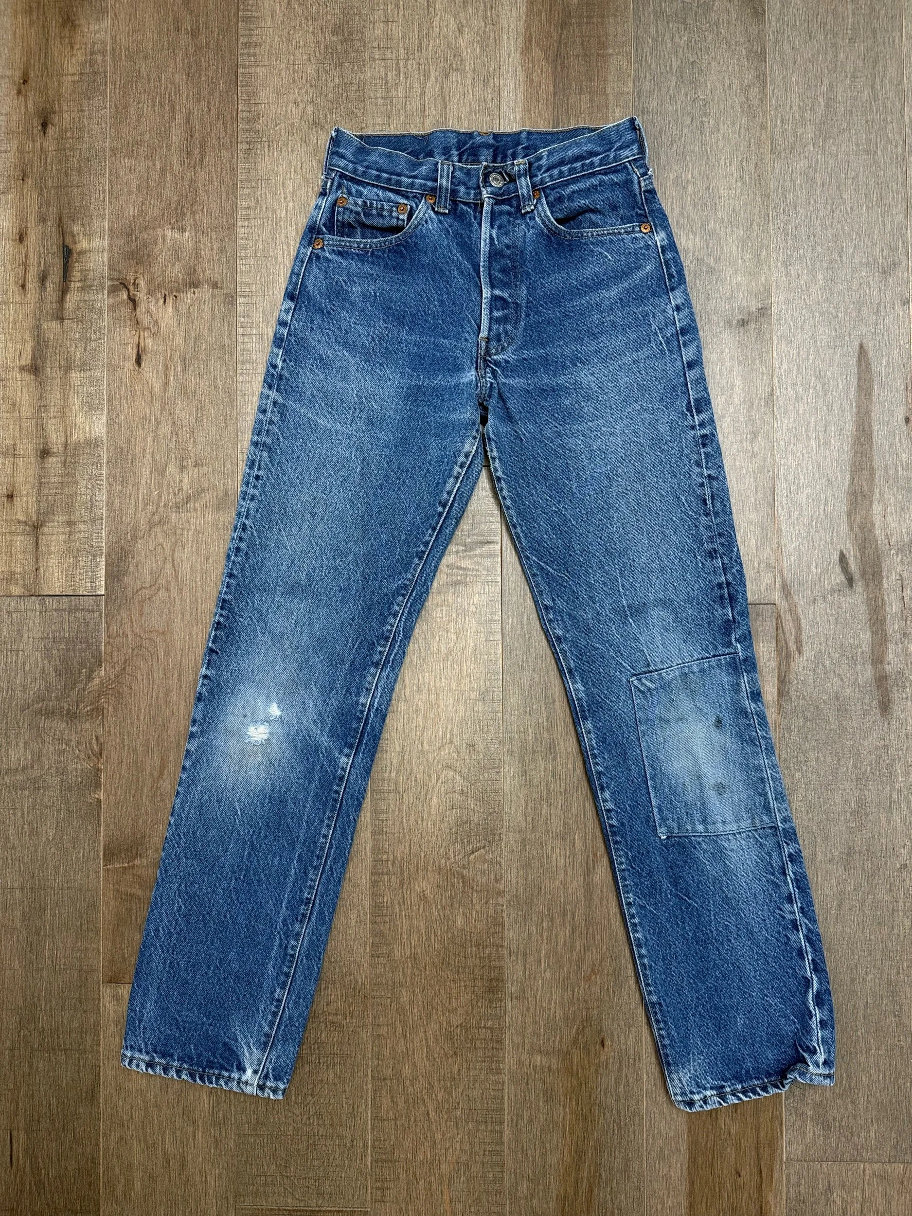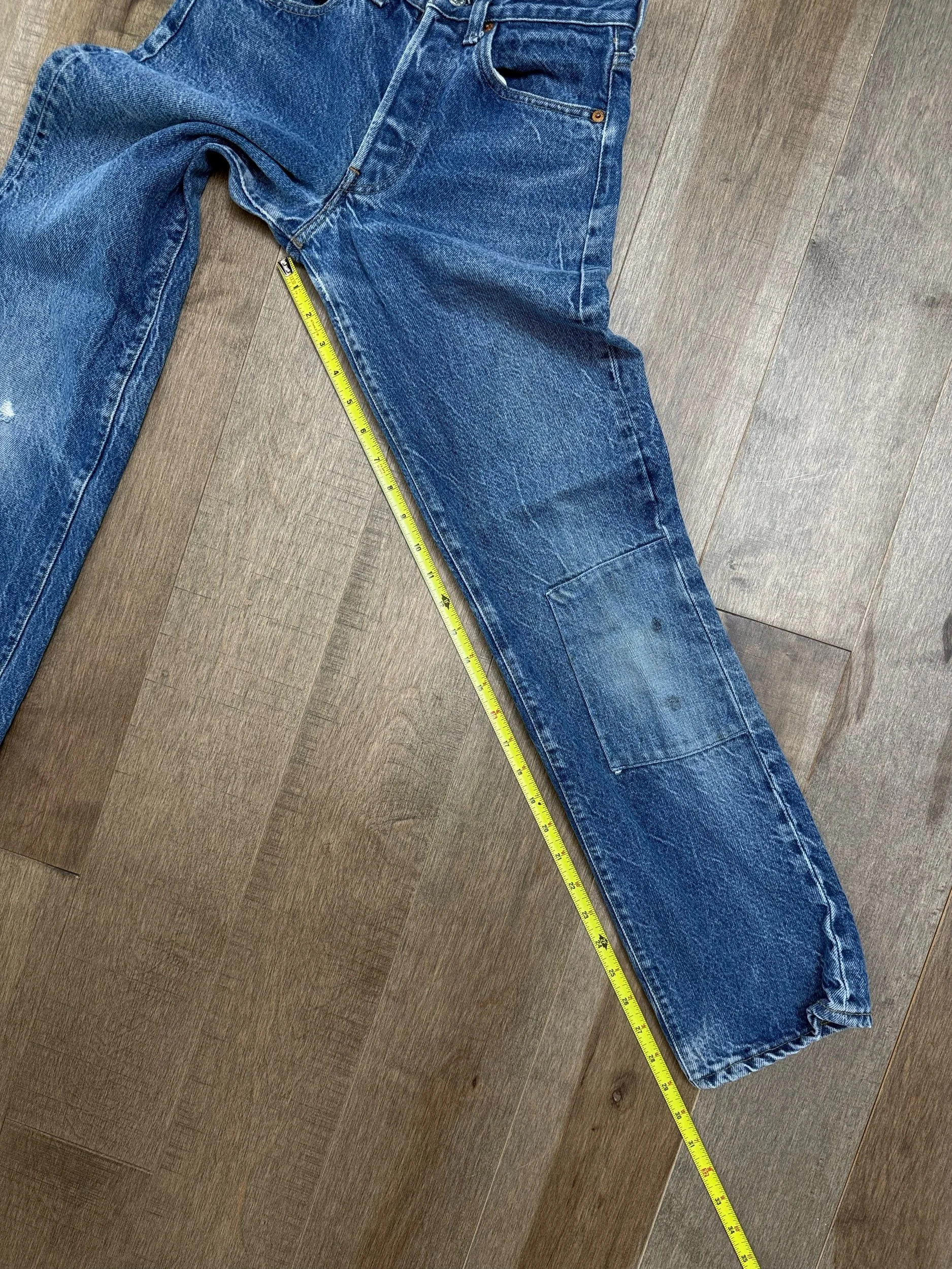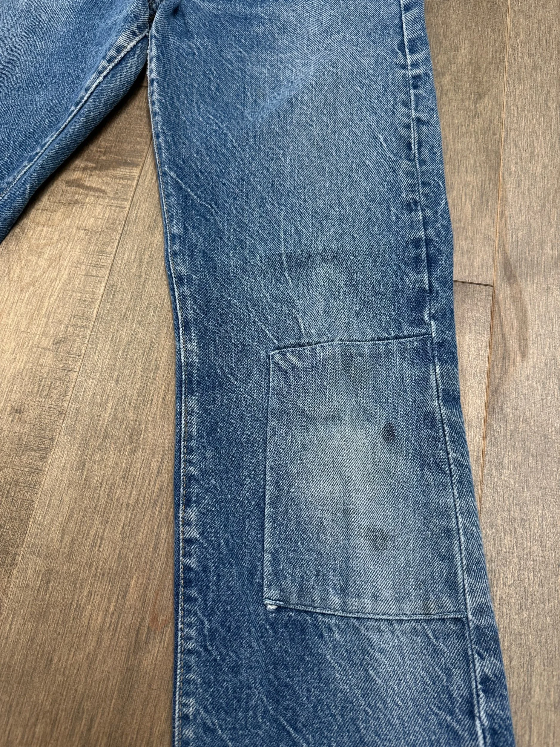WASH: beautiful classic medium blue wash with perfect organic sun fades and cool knee distress on one knee and a patch repair on other. Black bar tacks collectors love.