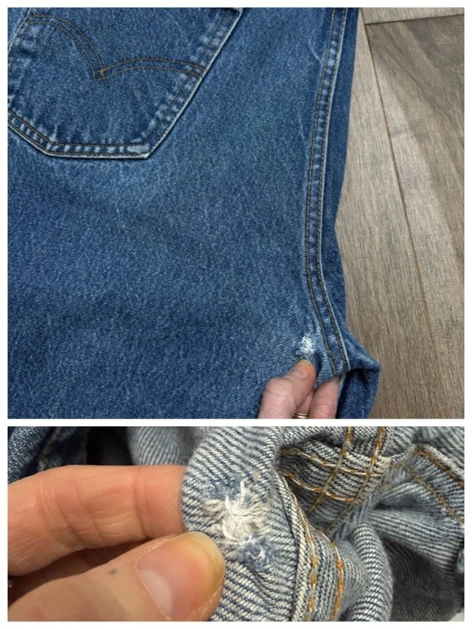 Keep in mind, vintage jeans are not new jeans. Every pair is at least 20 years old, most are older. This means they’ve been worn and likely have signs of wear - i.e. thinning areas, loose threads, signs of previous repair work, discolorations, faint (or not so faint stains), organic distressing, wear at the rivets, wear at the button holes. I do my best to describe these areas/signs of wear&tear, so please - before you buy - understand that you may receive your jeans and there will be signs of aging. Most buy vintage jeans wanting this, but if you want pristine new looking jeans, vintage likely isn’t for you. And that’s A-OK! Also note, the word “vintage” is not synonymous with super worn & faded. Vintage means over 20 years old. An item can be both vintage and still be new or like new condition.