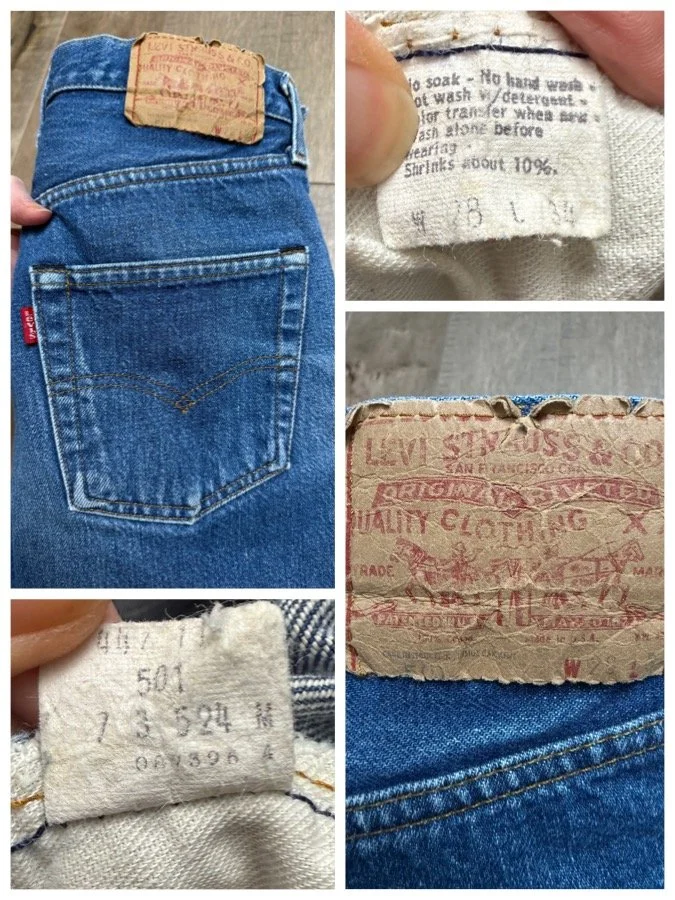 HISTORY LESSON: Levi’s stopped selvedge in 1984. Furthermore… Prior to 1971, there’s a Big E on the red tab. These are the most sought after vintage Levi’s. And valuable, and will only increase in value. Some sellers have stopped selling big E and only keep as an investment because they’re becoming so rare. Some folks cut the red tabs off back then, but you can tell the “big E” apart because of the single stitch on pockets and other telling characteristics. If there’s a V-stitch on the inside of the main button, it’s pre-1969. If there’s Selvedge in the coin pocket, it’s pre-1965. And on and on… 😉