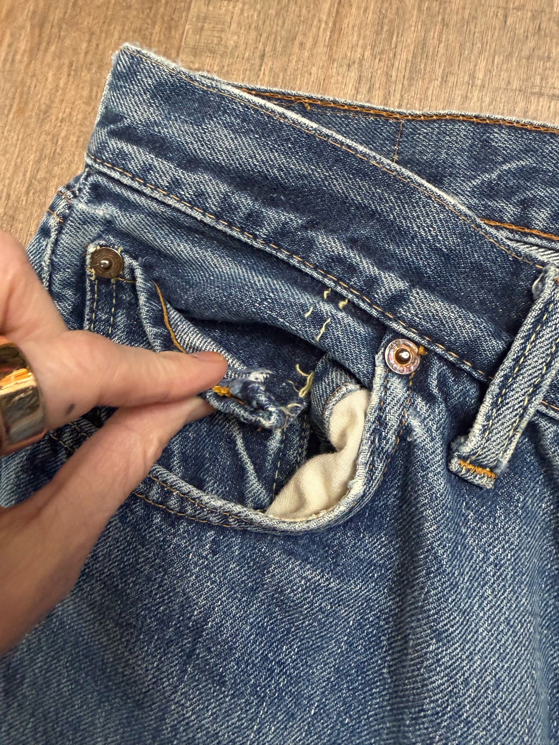 HISTORY LESSON: Levi’s stopped selvedge in 1984. Furthermore… Prior to 1971, there’s a Big E on the red tab. These are the most sought after vintage Levi’s. And valuable, and will only increase in value. Some sellers have stopped selling big E and only keep as an investment because they’re becoming so rare. Some folks cut the red tabs off back then, but you can tell the “big E” apart because of the single stitch on pockets and other telling characteristics. If there’s a V-stitch on the inside of the main button, it’s pre-1969. If there’s Selvedge in the coin pocket, it’s pre-1965. And on and on… 😉